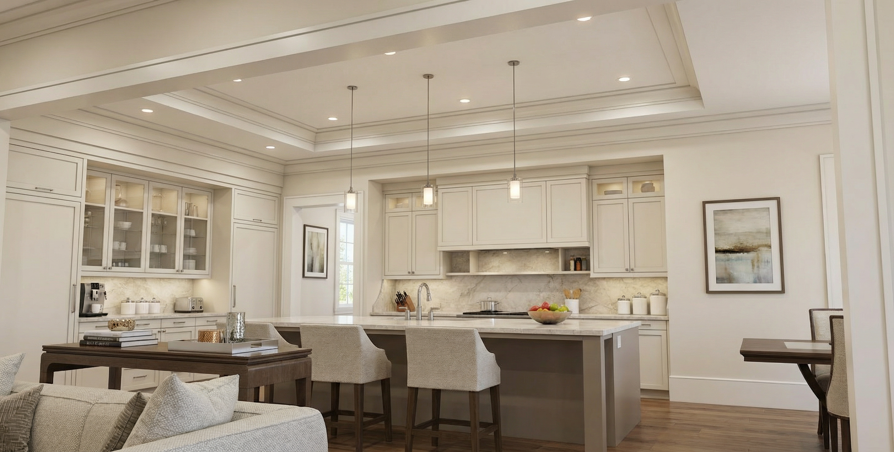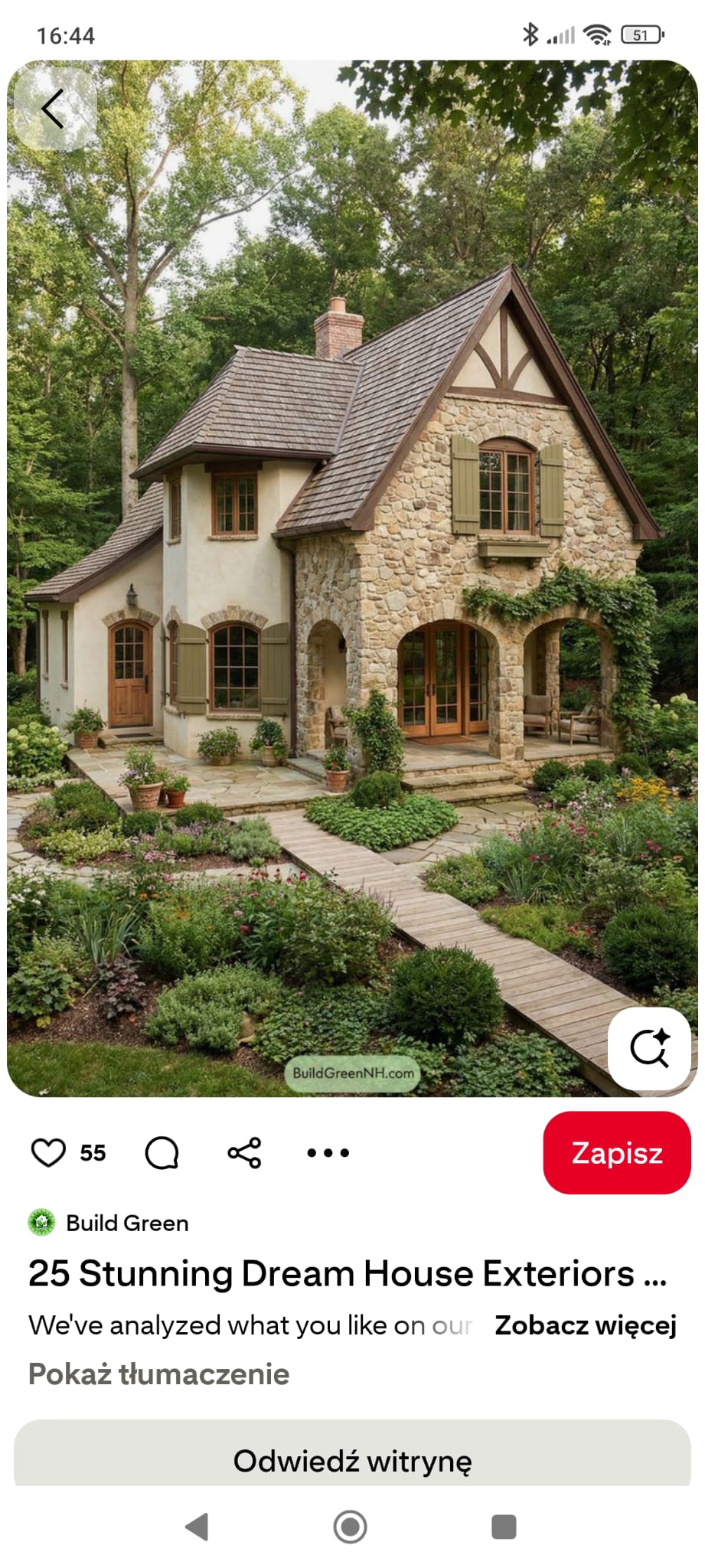 exterior shot a cozy house with a sloped roof exterior walls in light stone texture and white structural columns the roof is a soft beige with subtle gray undertones complemented by deep brown accents on the roof s borders the windows are framed in a rich warm brown adding charm and warmth the porch floor is a dark polished wood the lush green grass surrounding the house adds a lively contrast the overall atmosphere is serene and inviting bathed in the gentle golden light of a late afternoon sun