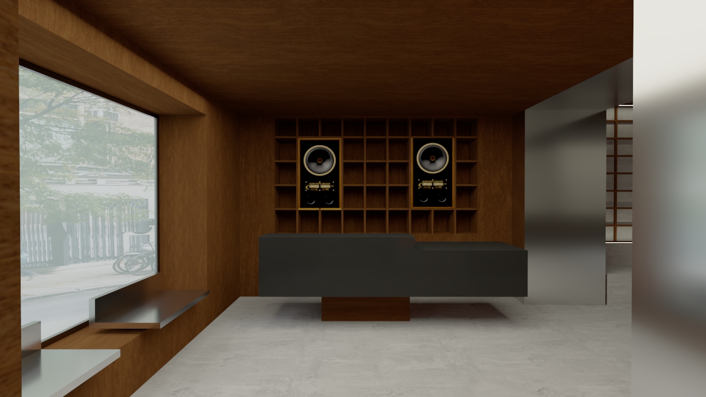 make very subtle realistic enhancements to the image while preserving the original atmosphere and composition slightly improve fine details and textures to look a bit more natural and realistic without over sharpening add very soft hidden ambient lighting inside the shelves located on the central grid structure the lighting should be discreet warm neutral and barely noticeable as if integrated led strips are subtly illuminating the shelves add faint natural daylight entering softly from the left window at a slight diagonal angle creating gentle realistic light falloff and soft shadows outside the left window introduce a very subtle and slightly blurred urban scene a sidewalk and small shops across the street resembling a typical athens street the exterior should be faint and not distract from the interior just lightly visible shapes signage and building facades maintain realism at all times avoid dramatic lighting avoid over processing and keep all changes minimal and natural