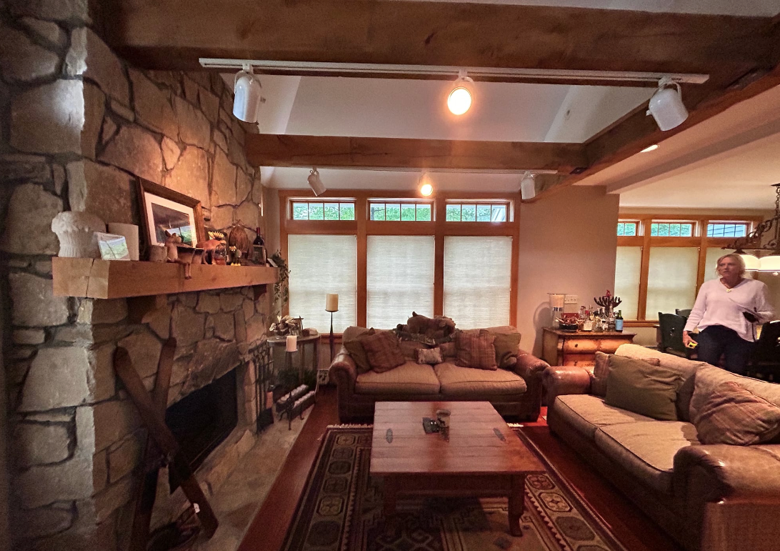 i want to take this room and create a render with new furniture to show a client we want a mink velvet sectional with bench cushions where the current sofas are and a round grey dark wood coffee table in the middle