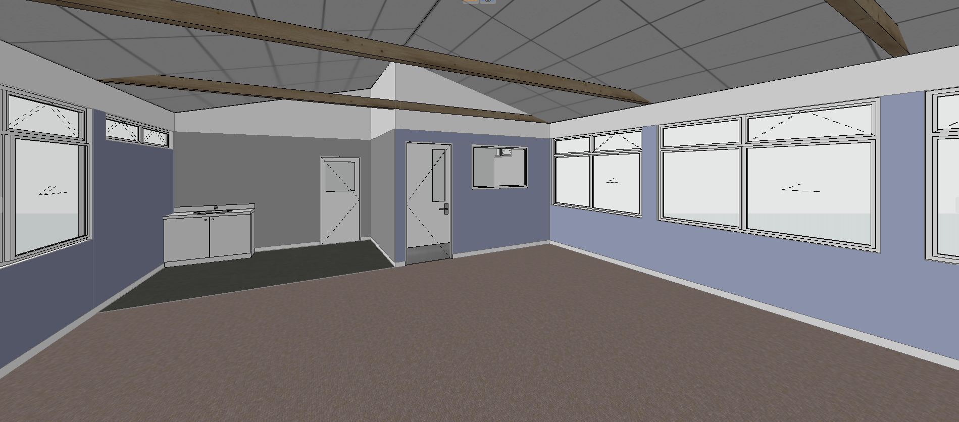 render a photorealistic 3d perspective of this internal classroom in northland new zealand reference the current material style just enhance them reference the current colour selected walls keep model windows doors roof walls geometry the same show doors closed back door into another internal space feature blue wall linings feature grey wall linings on external wall make a exterior environment with tress grass outside do not change the view only enhance the current materials detailed textures and glass reflections add a vibrant clear sky with light atmospheric depth render in hyper realistic architectural visualization quality 8k resolution