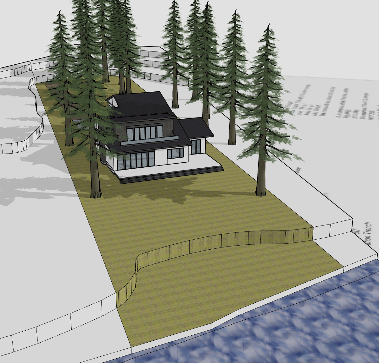 render a serene landscape featuring a modern house with a sleek black roof and off white walls situated at the center of a lush green lawn tall evergreen trees with deep green needles tower around the house providing a sense of seclusion and tranquility the scene is bordered by a gentle lake with shimmering blue water reflecting the sky the atmosphere is peaceful and calming evoking a sense of harmony with nature