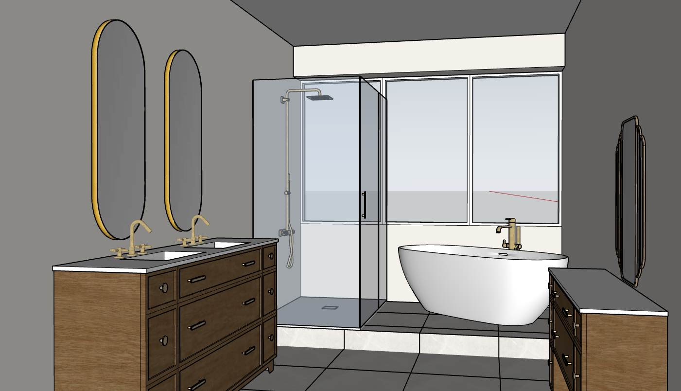 cr er un rendu d une salle de bain au lignes classiques lumi re naturelle les mat riaux en laiton doivent tre tous de la m me nuance le carrelage au sol doit tre respect