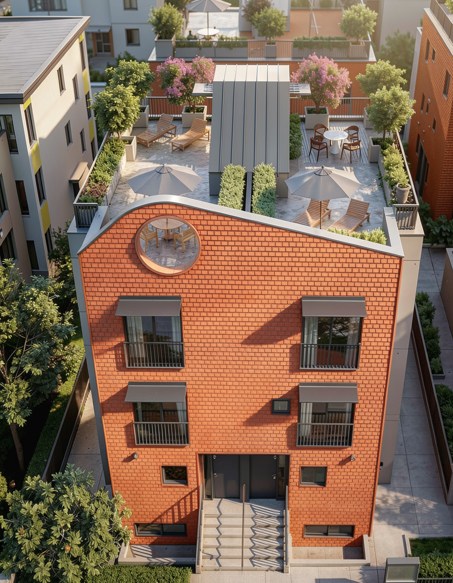 exterior shot use the uploaded image strictly for geometry proportions window placement roofline stairs and composition do not alter the building structure or redesign any architectural elements use the reference image only for material realism lighting quality shadow depth and overall photographic mood do not copy any architectural features from the reference convert the uploaded building into a realistic architectural photograph with the same level of surface detail lighting behavior and environmental realism as the reference image front fa ade material red interlocking square shingles arranged in a brick like running pattern these are shingles not brick introduce subtle tonal variation natural seams slight irregularities and realistic surface depth side wall smooth modern gray panel material with subtle joints and soft natural shadow gradients railings black powder coated steel with realistic reflectivity and minor wear glass natural outdoor reflections from surrounding buildings and trees balanced glare realistic transparency stairs poured concrete with subtle aggregate texture and natural edge wear lighting natural midday sunlight with defined but realistic shadow direction soft ambient bounce light no flat cg lighting environment realistic urban residential context with similar height apartment buildings nearby natural landscaping variation subtle sidewalk texture and real outdoor atmosphere camera architectural photograph shot at street level with a 50mm full frame lens at f 5 6 natural depth slight lens distortion no render style sharpness color grading natural daylight color science no hdr no hyper polished rendering look make this look like a real photograph taken outdoors not a 3d render