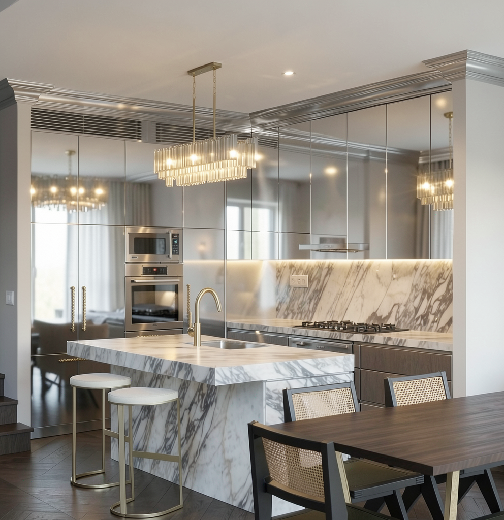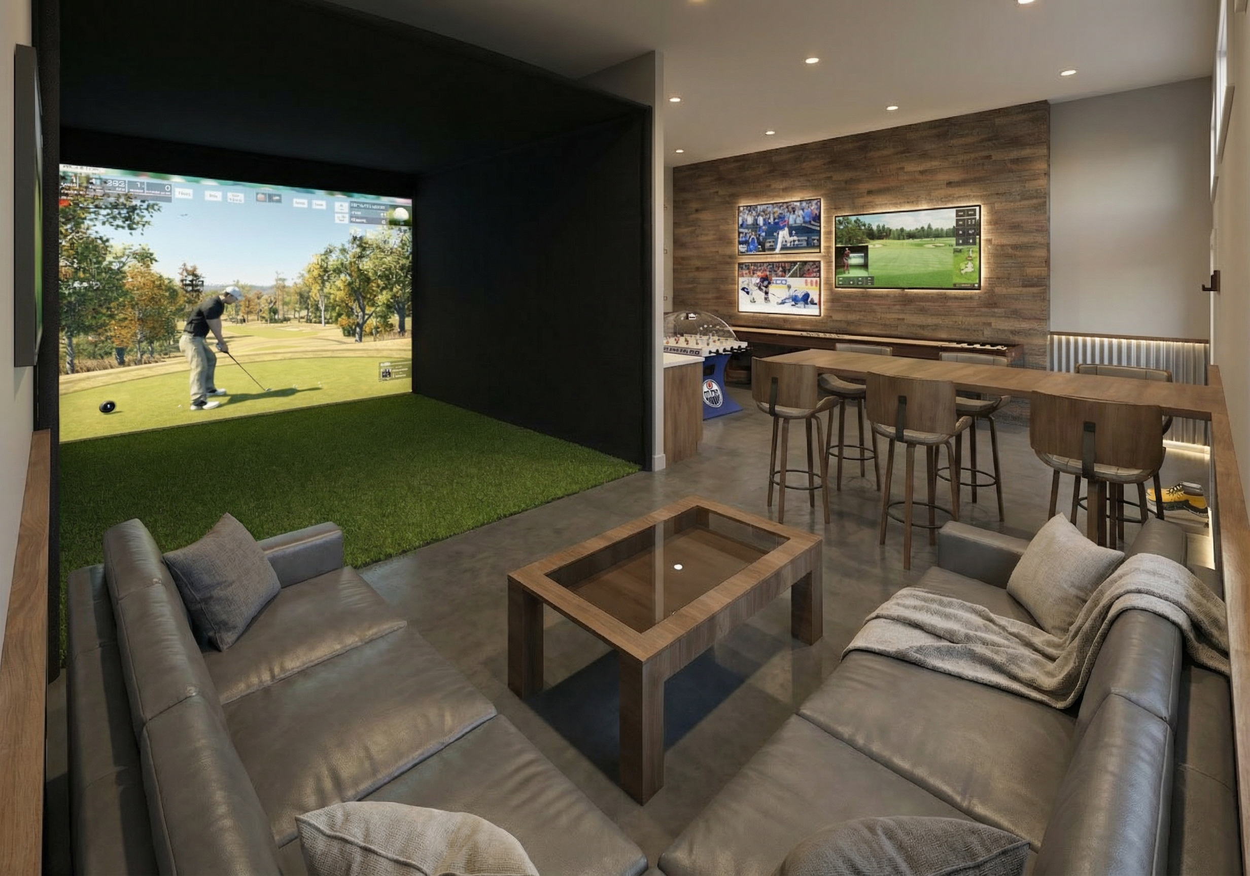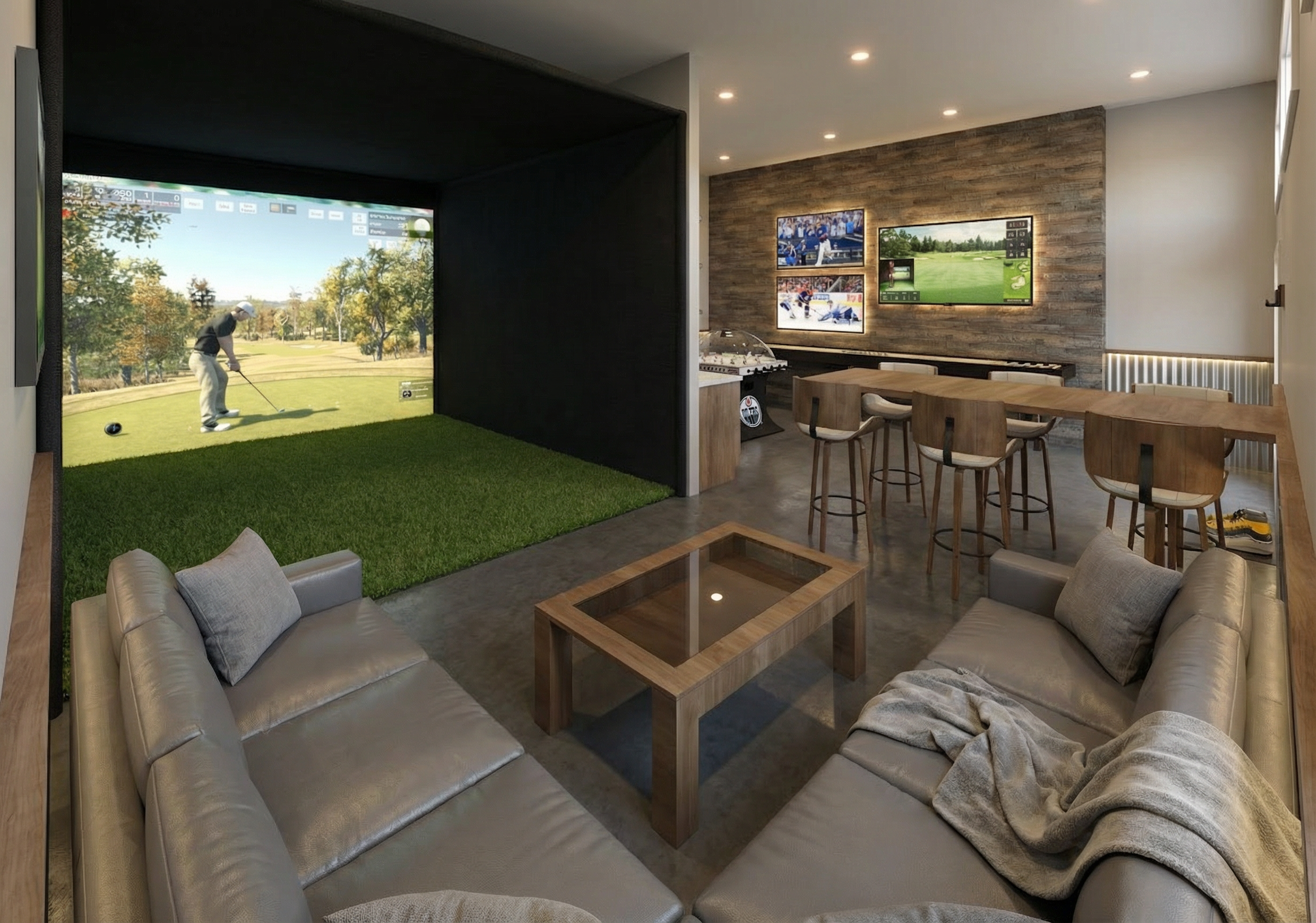 a modern rustic man cave games room the room contains a golf simulator with a fake grass green floor and black fabric walls other items include shuffleboard with black weights nhl super chexx pro bubble hockey with black base and oilers logo on the base poker table behind the bubble hockey trimmed in black leather the tv s on the far wall are displaying a high definition blue jays game on the top tv and a high definition golf simulator game on the bottom tv the tv on the right wall above the poker table is displaying a high definition edmonton oilers game the bottom 42 of all exterior walls are finished in galvanized vertical corrugated metal capped at the top with a small wood sill with underlighting that accents the corrugated metal no lighting at the bottom of the corrugated metal the bar wall is a feature wall finished above the corrugated metal with horizontal medium large planks of rustic reclaimed wood the other walls are painted benjamin moore simply white the cabinets against the reclaimed wood wall are a walk up bar with three open wood shelves above each shelf has a soft subtle led strip along the top back edge that lights up the alcohol bottles on each shelf no toe kick lighting on the bar cabinet personal ice maker on the right side of the light colored granite bar top cabinet hardware is a flat black metal finish soft natural light coming through the windows and pot lights throughout providing gentle ambient soft mood lighting make all the wood for bar cabinets bar shelving table chairs and corrugated steel trim a medium dark wood grained birch the floor should be a medium dark gray cut and polished concrete floor do not add windows preserve the original image as a background plate keep everything else unchanged forbid geometry reconstruction