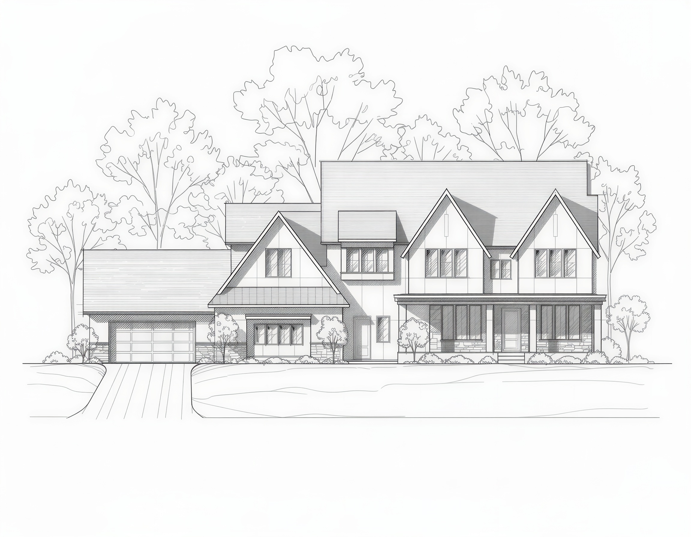 architectural front elevation of a modern craftsman style house with multiple gables attached garage on the left and a covered front porch render as a loose artistic hand drawn sketch in pure black and white only no color no grayscale washes no watercolor no markers use graphite pencil and fine liner ink style only emphasize expressive sketchy linework with varied line weights visible construction lines and intentional imperfections add soft pencil shading cross hatching and line based shadowing to create depth keep the composition clean on a white background similar to an architectural concept sketch trees and landscaping should be lightly sketched and minimal style reference architectural sketchbook drawing monochrome ink and pencil loose and artistic not a polished render not digital shading