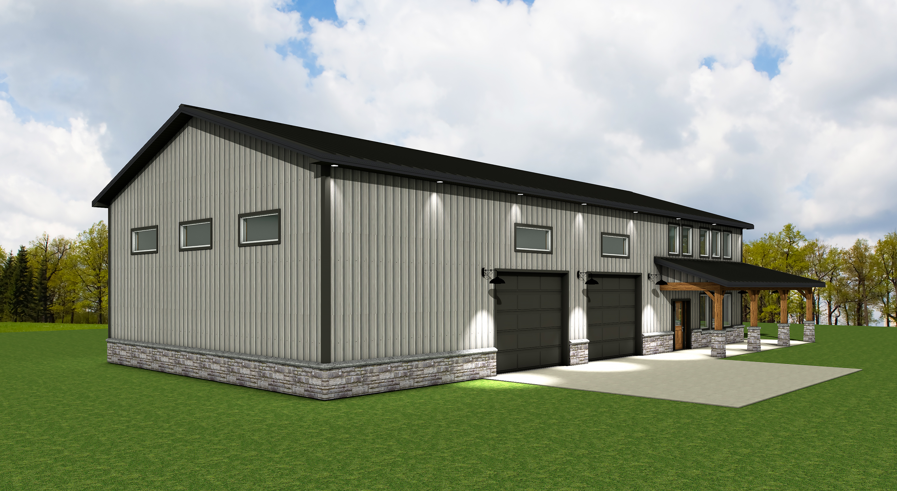 a modern two story barndominium farmhouse with light gray vertical metal siding black standing seam metal roofing exposed wooden timber posts supporting the covered patio retain the exact structure window arrangement patio columns balcony chimney rooflines foundation height and proportions exactly as shown in the reference image add a smooth concrete front driveway extending toward the house integrated naturally into the terrain surround the property with a lush dense forest of tall mixed evergreens and hardwoods place the sun behind the trees so warm golden sunlight beams through the branches casting soft rays and subtle dappled highlights across the patio siding and grass create ultra realistic lighting crisp shadows detailed textures in the siding and glass reflections and a vibrant clear sky with light atmospheric depth render in hyper realistic architectural visualization quality 8k resolution