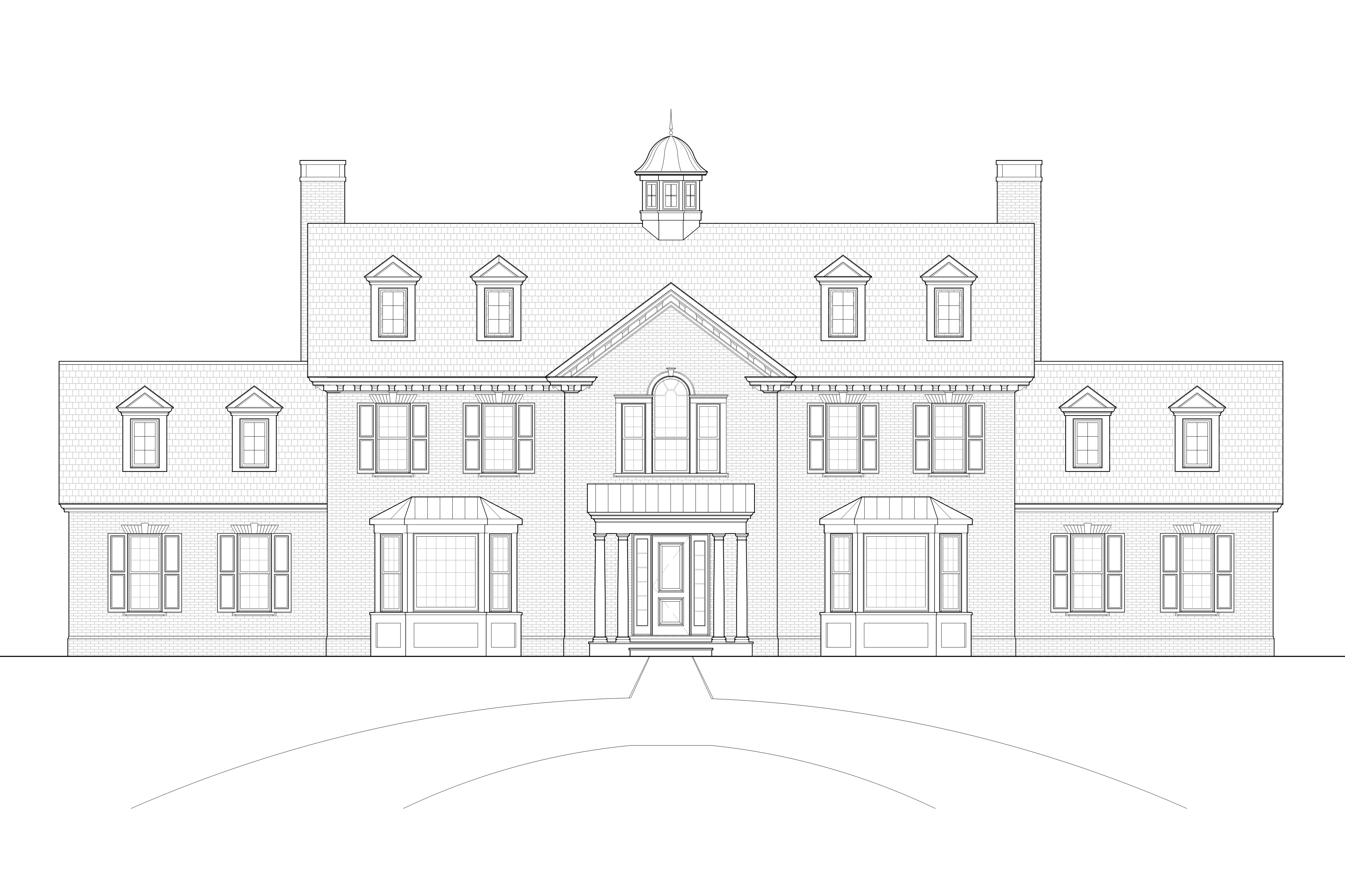 exterior shot exterior photo of a georgian revival style home with white windows red bricks black shutters dark slate for the main house copper roof for the front porch and bay windows and landscaping in front of the house