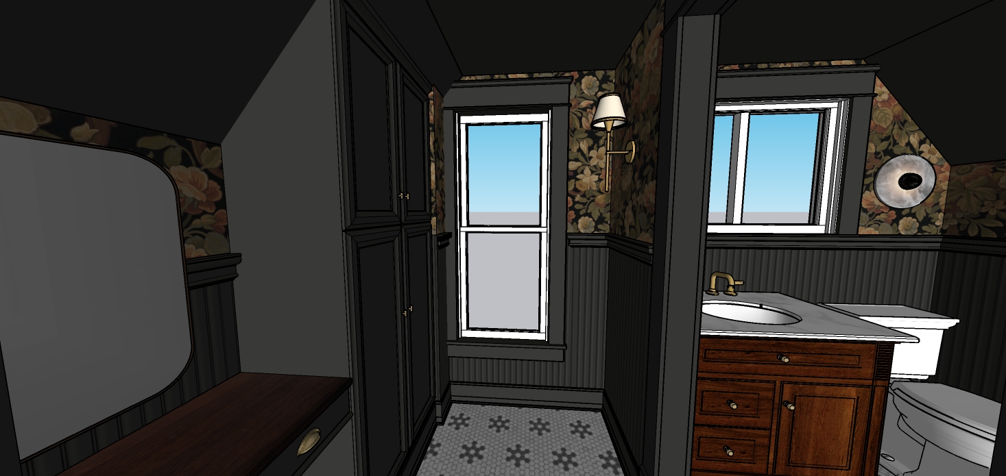 maintain all geometry create a hyper realistic interior rendering this is a second floor room so the view out of the window should reflect that and show trees in the distance the painted casework should be a semi gloss finish the wood casework should remain as wood with a gloss finish the sconces should be lit in a 2700k temperature and a soft glow the ceiling should be a matt paint finish the item above the toilet is a sconce that should show as lit in the center but diffused from view and there is a circular marble plate on the back that should glow show the mirror on the left side brightly lit around the edges