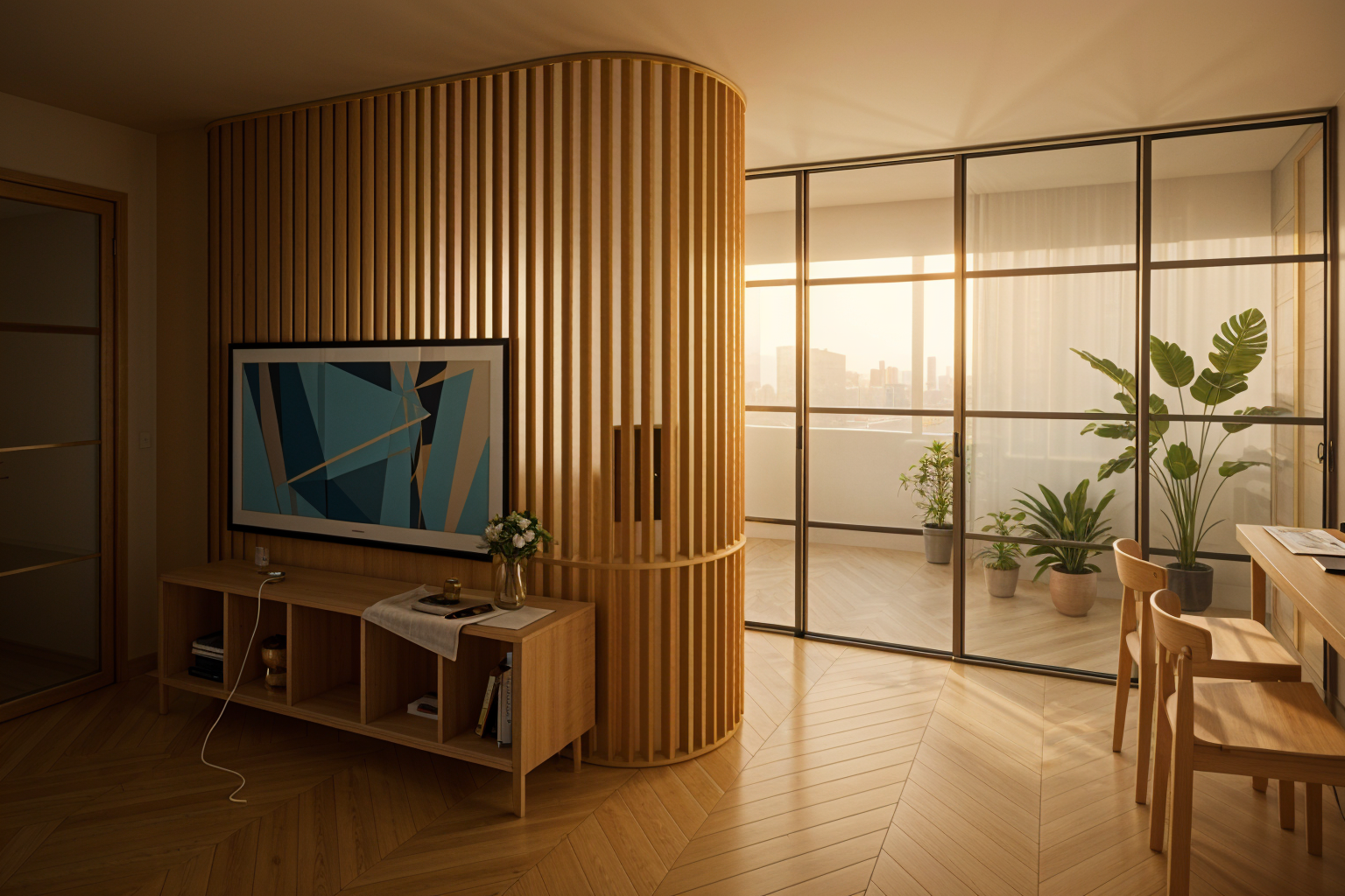 contemporary interior shot wall in warm white wood flooring side board in warm white with top in toblerone marble with tv on the wall the sofa in the center are in sula matcha fabric the library in warm white the rug is in light beige wool the view on a garden architecture