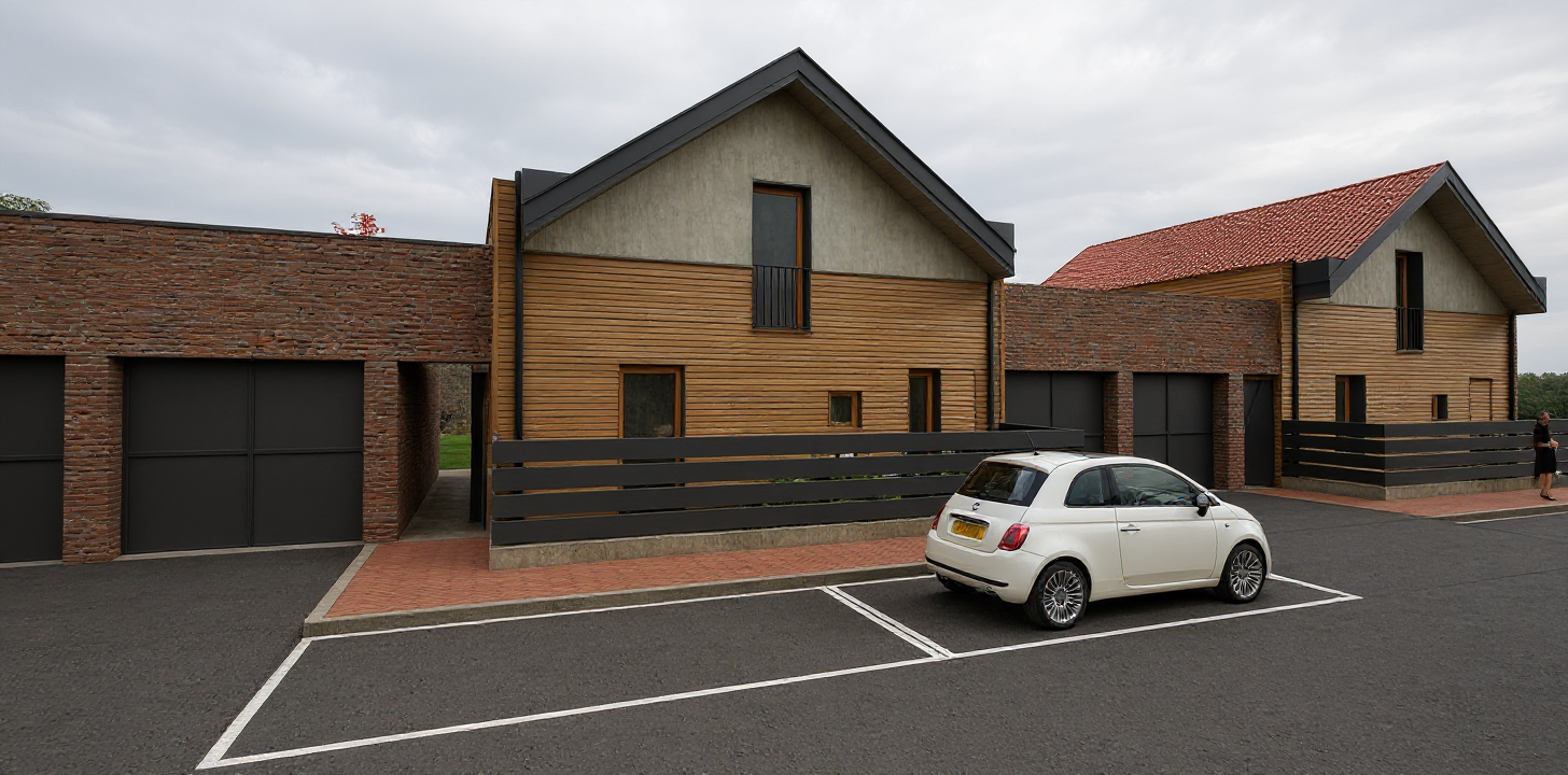 can you make a realistic rendering of this the far right garage needs to be an rv garage and tall keep the colors and textures the same