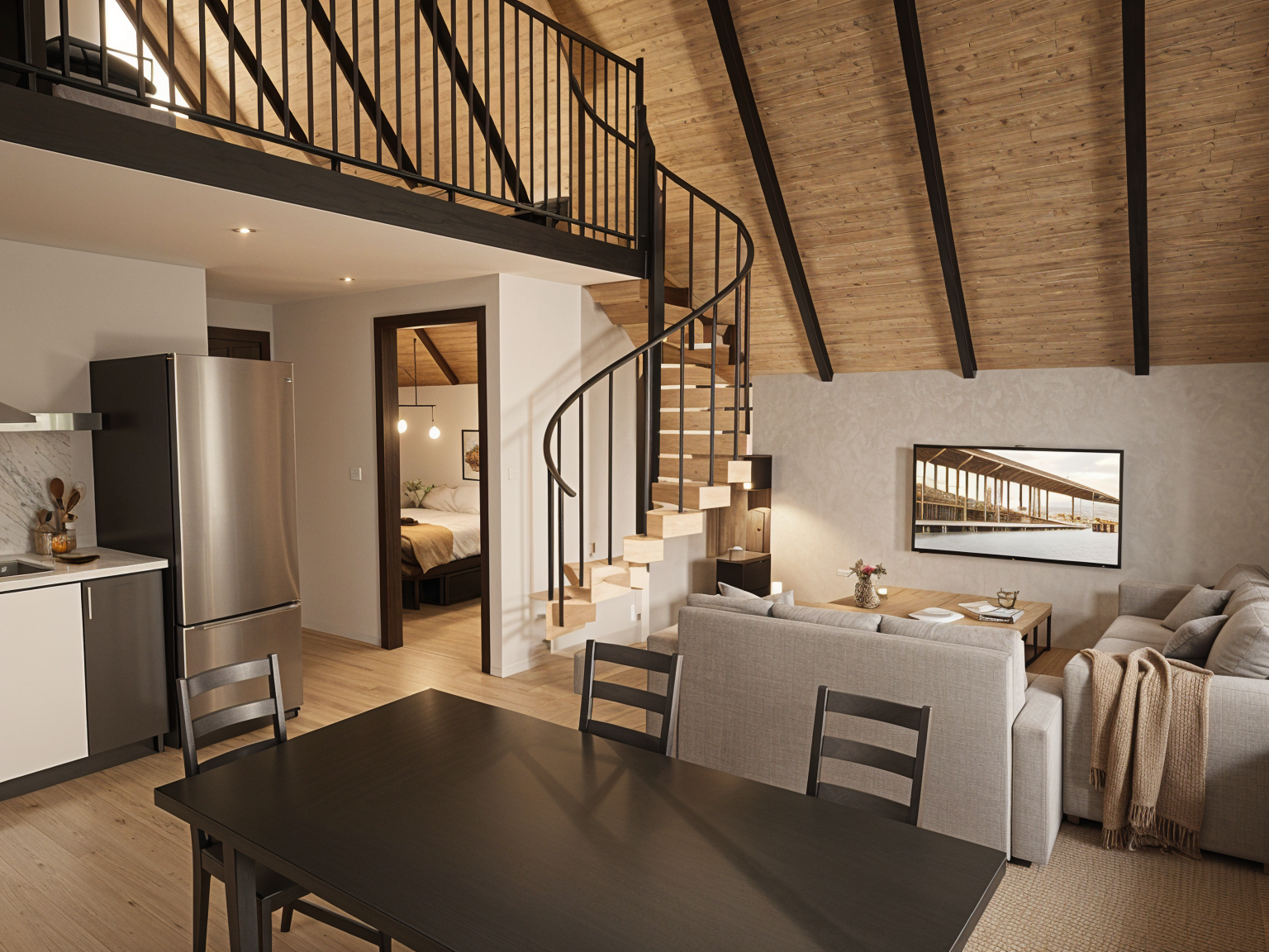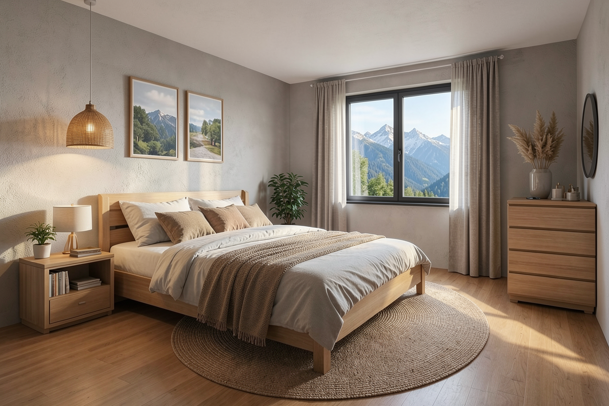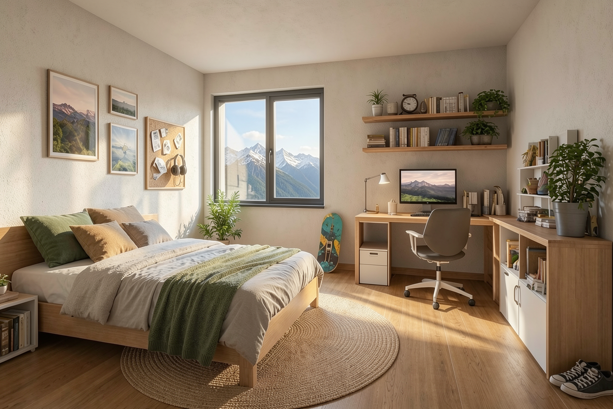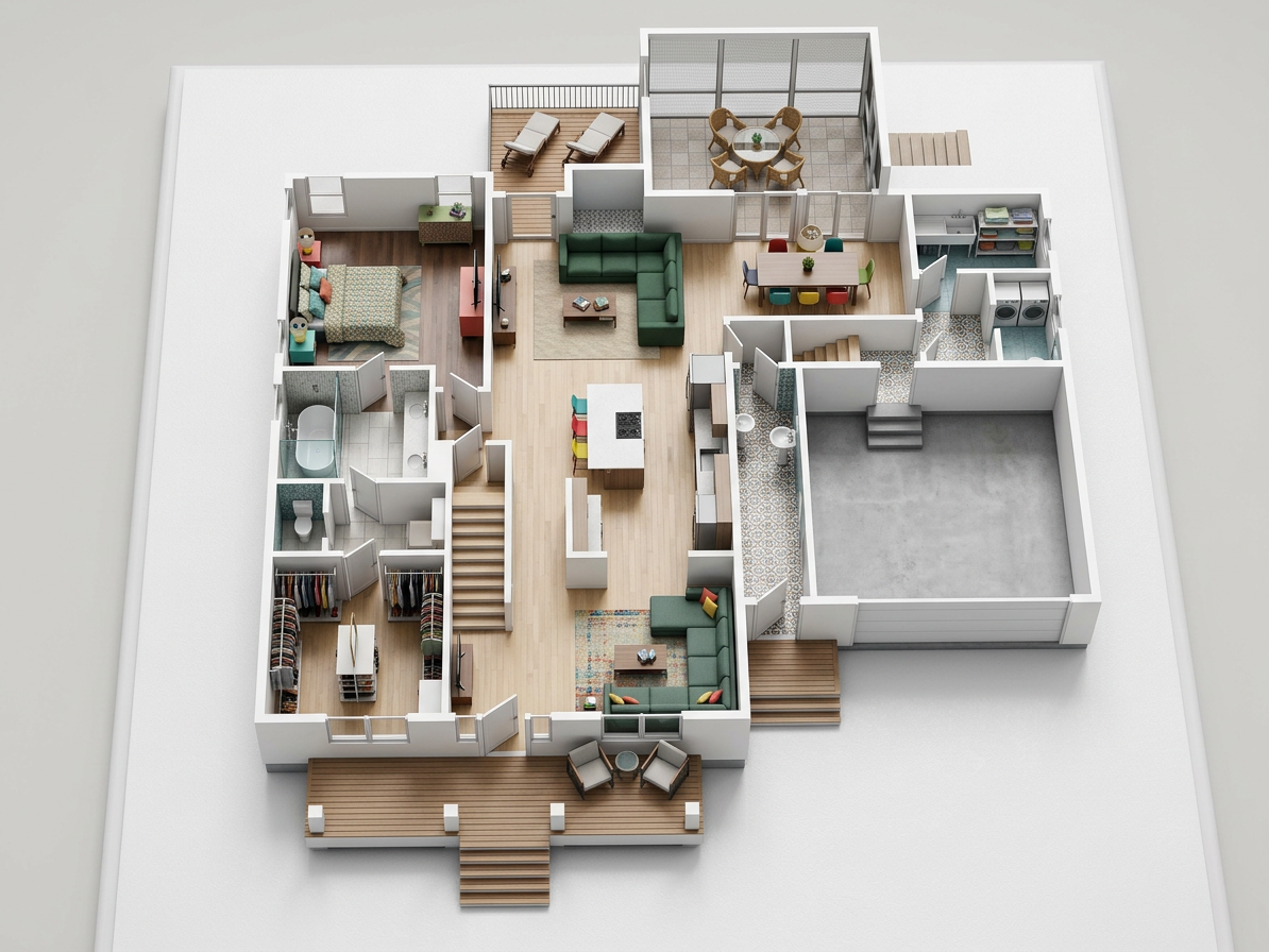 convert this floor plan into a realistic isometric 3d view of a full house show the space from an elevated angle with furniture walls and details visible house plan layout use the same furniture as shows on the plan do not change the orientation of the floorplan