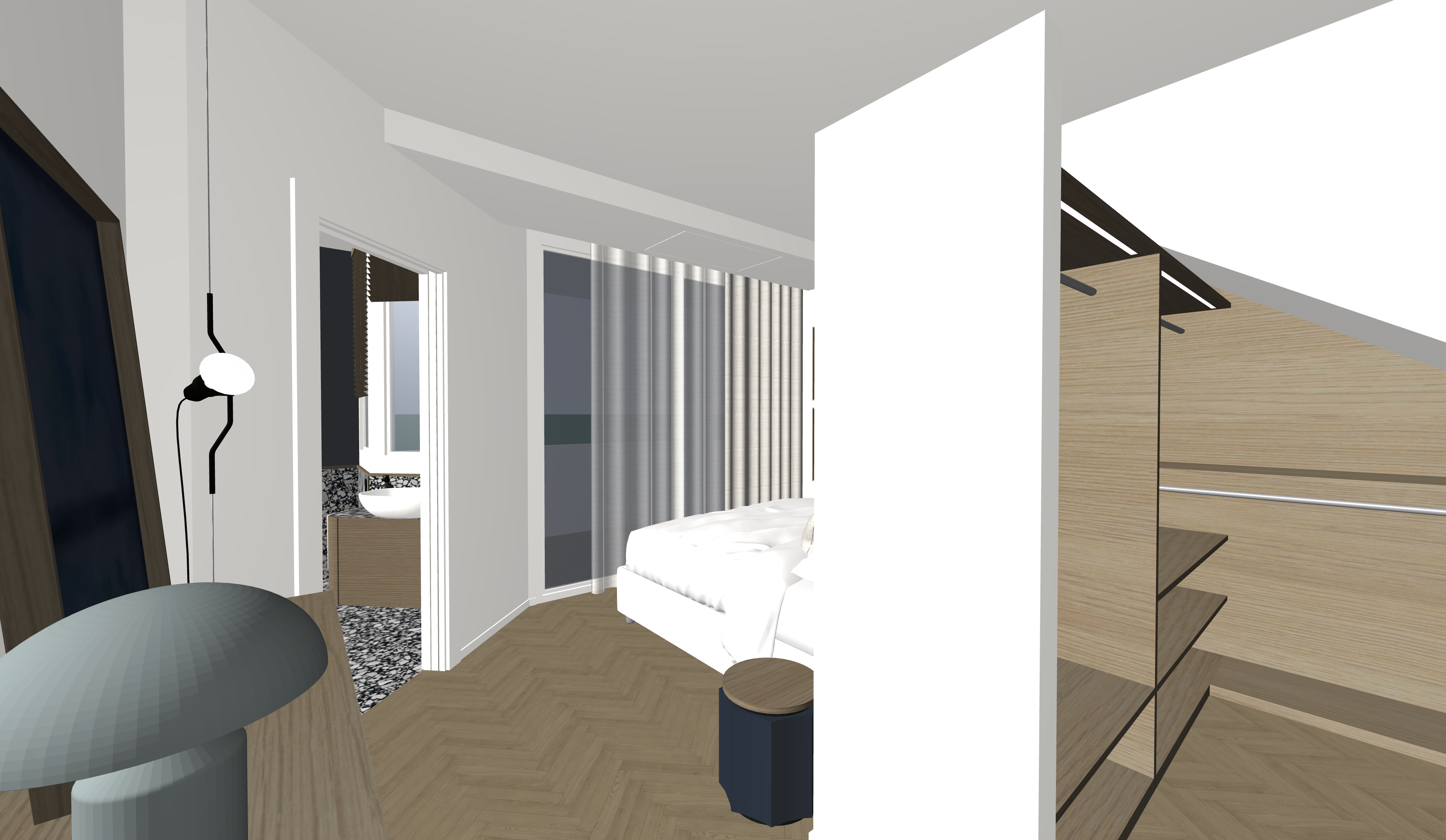 camera con letto matrimoniale in tessuto di cotone bianco caldo non ci sono strip led che illuminano la stanza a destra dell ingresso c una cabina armadio in legno rovere naturale con delle strip led sopra al tubo appenderia a sinistra la lampada da tavolo e la lampada parentesi di flos sono accese tra le due lampade c un quadro con un dipinto blu scuro lo stesso tono di blu lo troviamo sulla parete del bagno la tenda pesante di colore beige chiaro fai entrare un p di luce naturale dalla finestra e metti uno sfondo di un terrazzo con delle piante e vista mare in lontananza metti qualche oggetto su letto e dei vestiti e accessori nella cabina armadio