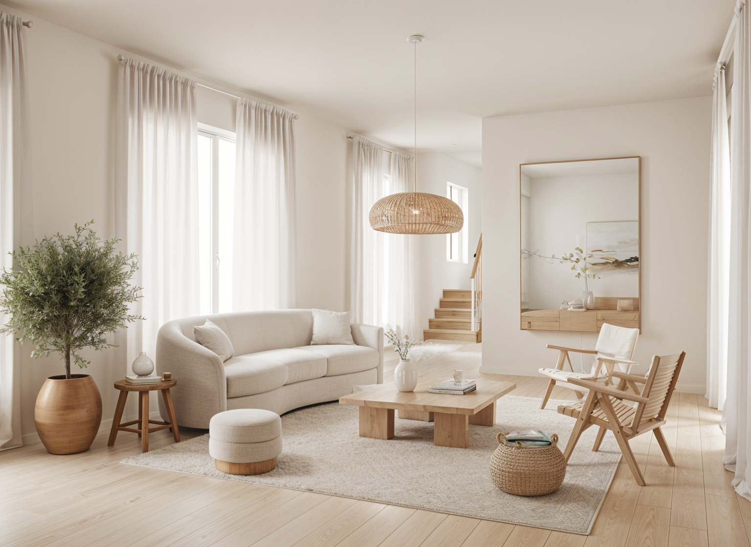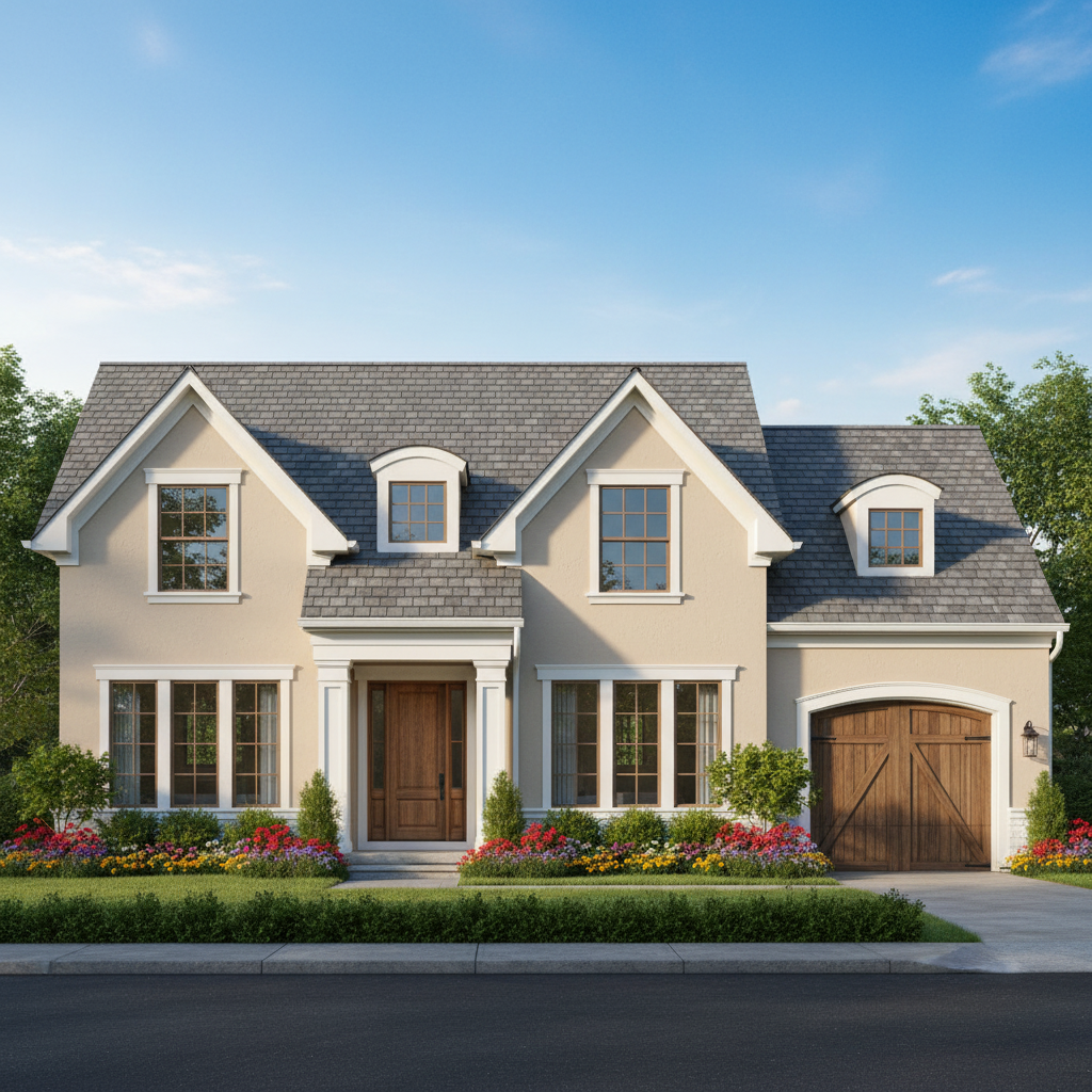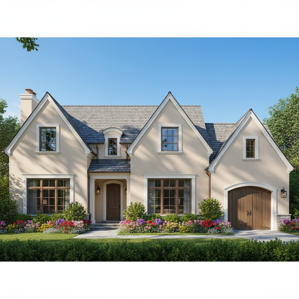 render a charming residential home with modern tudor eclectic architectural elements and gabled roofing the exterior is a warm lime washed painted brick include large elegant windows with dark brown frames and add a rustic wooden garage door the roof is a slate gray with subtle texture surround the house with green landscaping and flower beds trees at foreground and background the sky is a clear light blue and the sunlight casts gentle inviting shadows creating a serene and welcoming atmosphere
