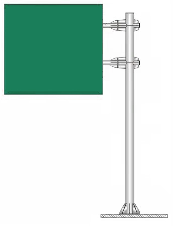 please render an external cantilever road signage in realistic 3d based on the uploaded design place the signage on a roadside grass curb during a sunny afternoon the signage is positioned on the right side of a 4 carriageway road facing a large roundabout ahead with palm trees in the background the design should be industrial in approach using a large robust support pole and a cantilever arm that holds a light aluminum panel emphasize scale by showing vehicles on the roadway ensuring the signage proportions are accurate relative to the 4 lane width highlight realistic daylight shadows metallic pole textures aluminum panel surfaces natural grass detail and the overall sturdy engineering of the structure render from a dynamic perspective view to capture both the road context and the sign s placement before the roundabout