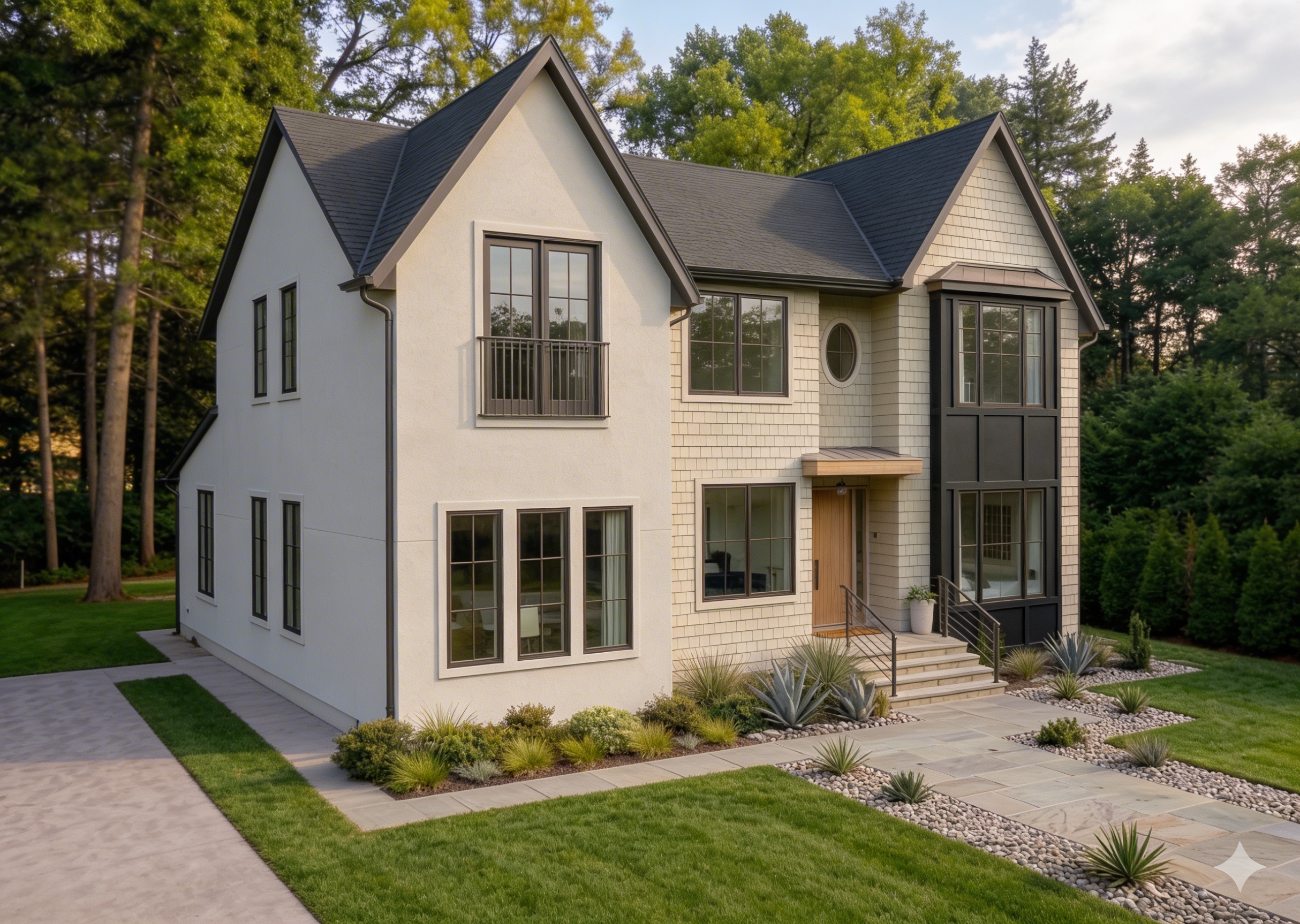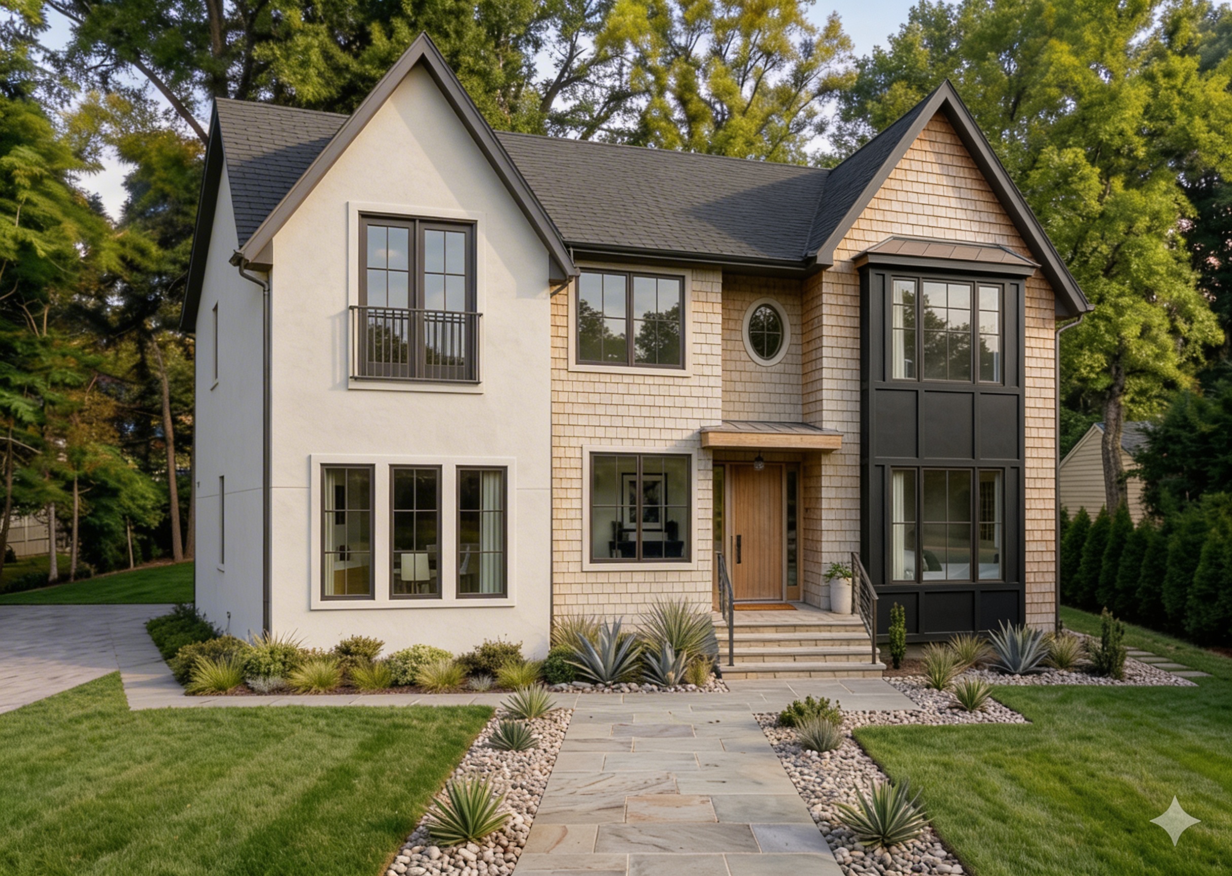 remove the construction scaffolding completely from the room and reconstruct the background naturally as if the scaffolding was never there reveal the staircase wall and floor behind it with realistic lighting and perspective replace the existing white balcony railing on the upper floor with a modern railing made of vertical walnut acoustic panels the railing should consist of narrow vertical wooden slats thin walnut ribs with small spacing between them similar to acoustic panel design rich walnut wood tone with a natural matte finish keep the structure minimalistic and aligned with scandinavian interior design maintain the original architecture lighting from the chandelier and realistic shadows so the modification blends seamlessly with the interior