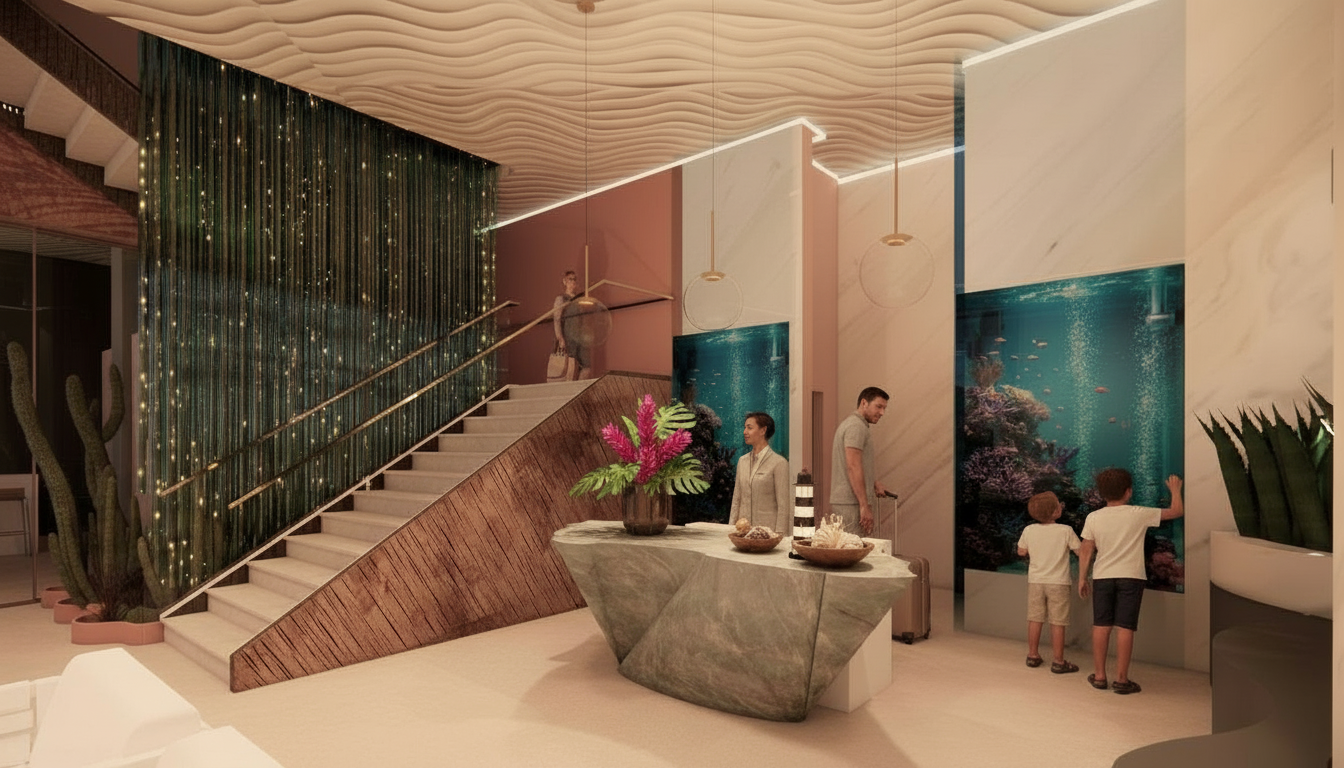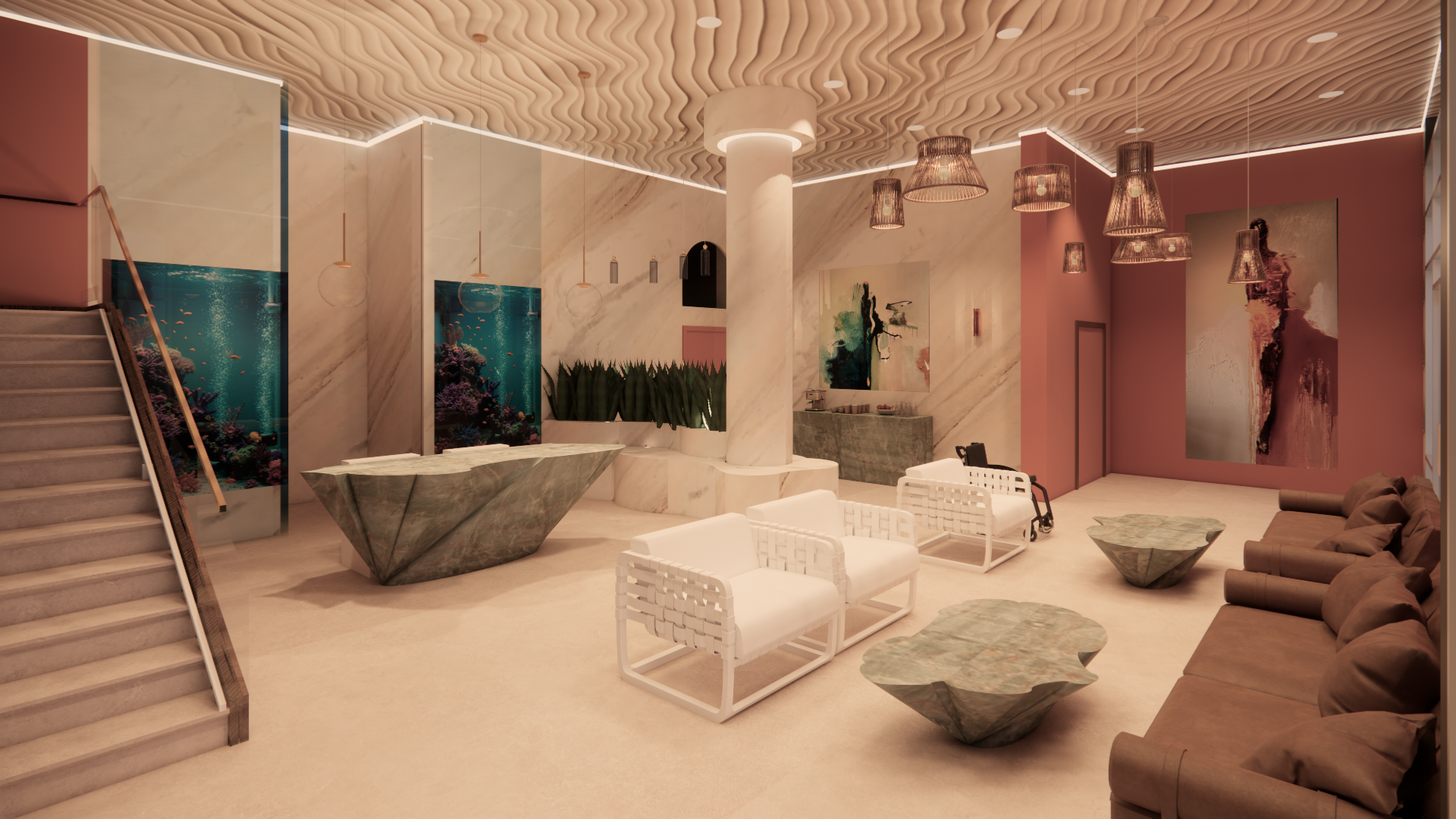 add people add bowls and vases to the coffee table put tropical flowers on the reception desk add a rattan rug underneath the coffee tables bring the reception to life