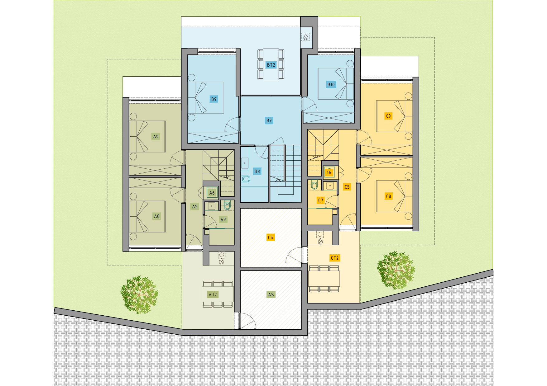 convert this floor plan into a clean high quality architectural presentation plan keep the exact original layout geometry wall positions room sizes doors windows and stairs do not redesign or modify the architecture render the drawing as a crisp vector style 2d architectural plan with strong graphic hierarchy and professional presentation quality style requirements solid dark grey or black poche walls precise thin interior linework simplified furniture symbols clear door swings and window openings minimal staircase graphics balanced white space subtle soft wall shadows for depth the drawing should look like a professional architectural competition plan similar to those published on archdaily or used by contemporary architecture studios keep the view strictly top down 2d do not generate a 3d model do not add floor materials textures wood tiles or shading patterns floors should remain plain light color use a light neutral background with strong contrast between walls and interior elements apply professional architectural line weight hierarchy walls heavy structure medium furniture light details very light the result should look like a clean minimalist architectural diagram suitable for presentation boards