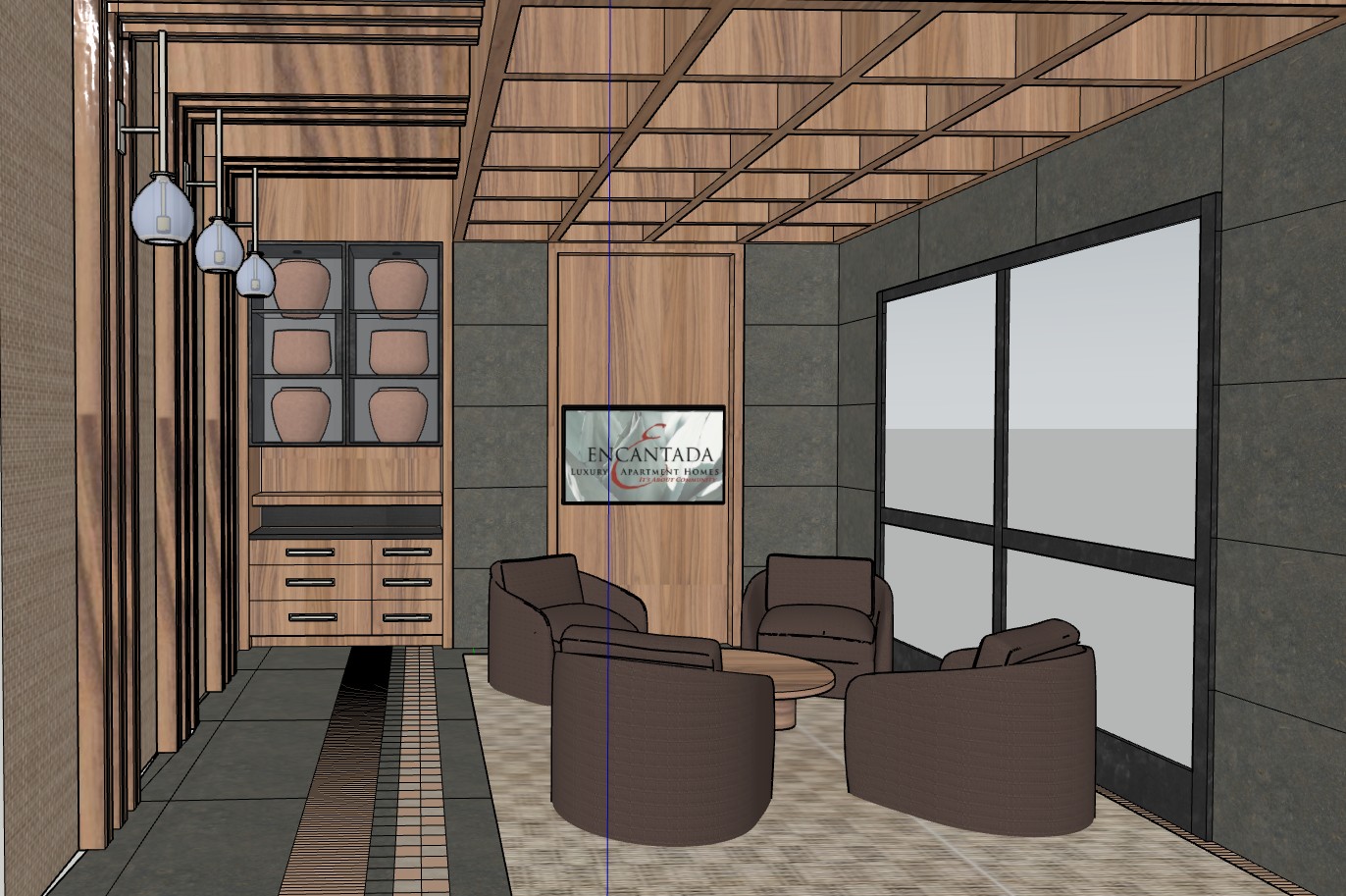 photorealistic interior with natural lighting show a tucson landscape outside the window put tucson city life on tv light the cabinet with the terracotta pottery cabinet has mirrored interior back add recessed lighting in the ceiling