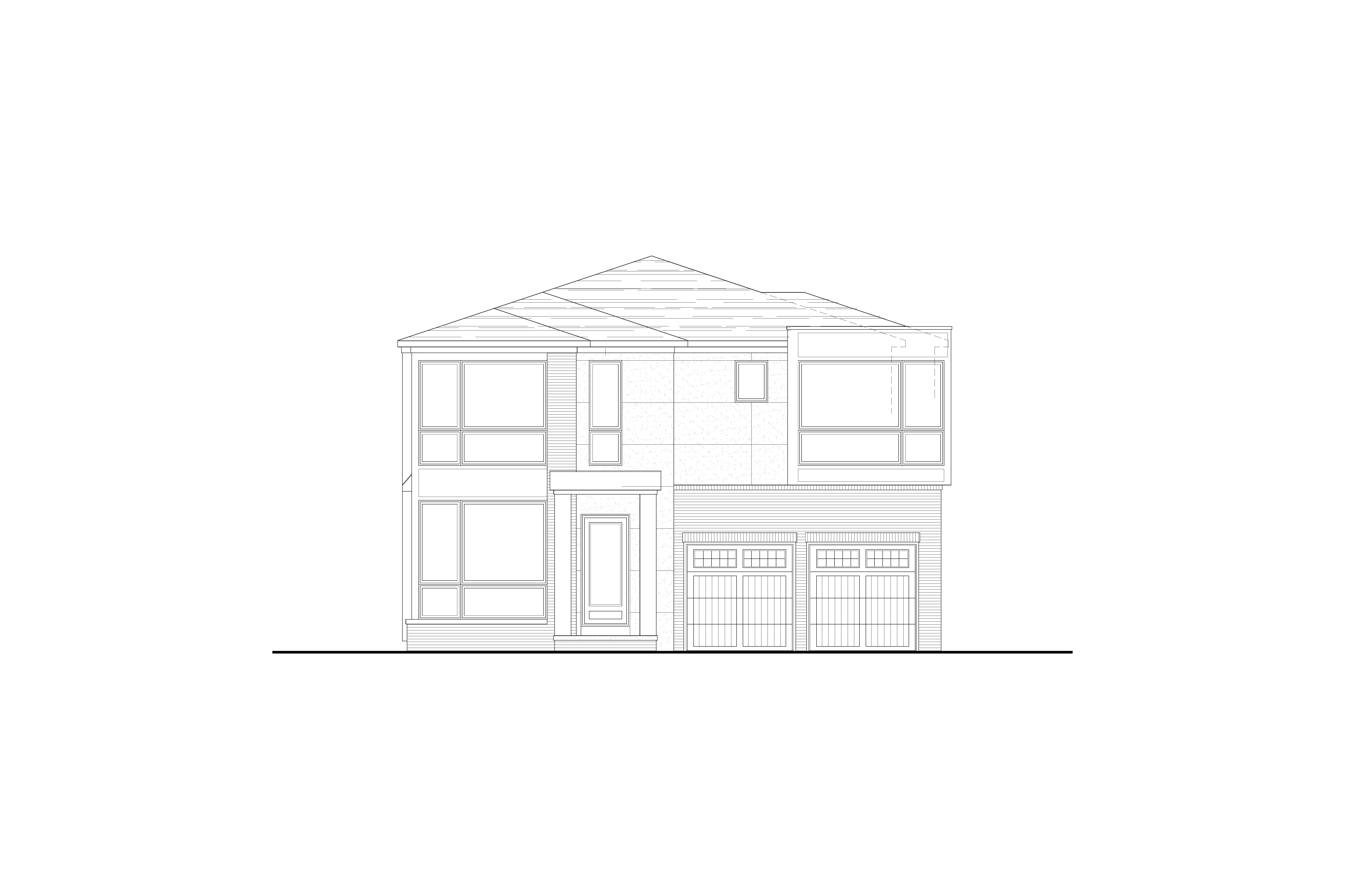 5 30pm a modern two story house with a sleek design featuring a light gray panels with dark gray trim dark red brick accents the entry the roof is a soft charcoal color adding contrast large windows dominate the facade reflecting the clear blue sky the front door is brushed steel with a frosted glass panel for sophistication the garage doors are cherry wood with contemporary glass inserts surrounding the house a lush green lawn with colorful flower beds in shades of pink lavender and yellow the atmosphere is serene and welcoming with evening sunlight casting gentle shadows do not modify the massing as shown architecture
