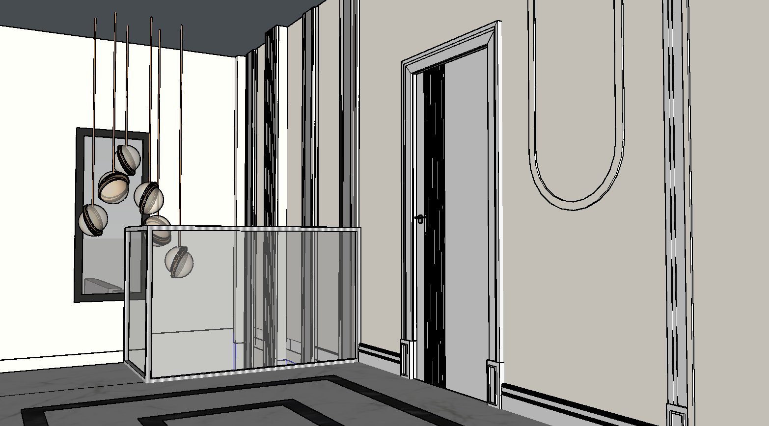 the right side of the wall has moldings and gray appearing mirrored sections between the moldings in soft and cream tones
