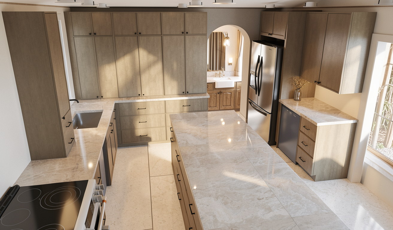 sundowner with soft shadows few clouds in the sky birds flying in front a terrace caf scene with brown wood outdoor furniture tables and chairs populated with semi transparent people sitting in front oft he building talking drinking coffee include a glass railing around a planted tree existing tree preserved realistic reflections and light style scandinavian minimalism clean geometry high realism soft warm lighting color oft he lightning warm yellow beige camera eye level perspective wide angle slightly from the corner facade made of sand limestone slabs format 120cm wide and 60cm high windows made of oak terrace floor made of sand limestone slabs format 120cm wide and 60cm long flat roof with a copper plate cover on the edge of the roof in the background are some houses like in a small town with trees in front of the building the floor is paved with beige natural stones in front of the building populated with semi transparent people and a dog walk past in the upper left corner a tree should look in