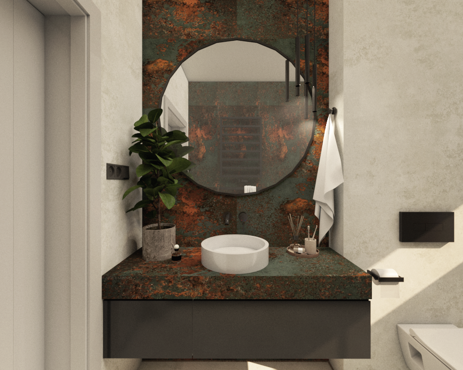 rustic modern bathroom with an industrial touch central round mirror with a distressed copper and green patina frame reflecting warm ambient light textured white walls creating a soft contrast dark stone countertop with a subtle rust finish minimalist white vessel sink and sleek black fixtures lush green plant in a stone pot adding natural vibrancy earthy tone toothbrush holder with brushes positioned beside a neatly folded white towel shadow play enhancing depth and texture ambient cozy atmosphere with a hint of sophistication