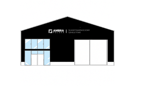 please create a realistic front view of the production hall using only the provided orthogonal projections of the front facade be sure to maintain the building s exact proportions and roof geometry a gently sloped gable roof with a white finish the exterior walls should be clad in black siding as shown in the attached photo with a subtle texture on the main facade please place a double leaf entrance door in anthracite on the left side on the right side there is a double leaf gate in anthracite but the gate frame must be white the lower part of the hall should be white please do not change the placement of doors windows or the facade layout everything must match the drawing the camera should be at eye level focal length 35 45 mm natural daylight soft shadows neutral uniform background semi realistic architectural visualization style clean and minimalist scene no surrounding elements