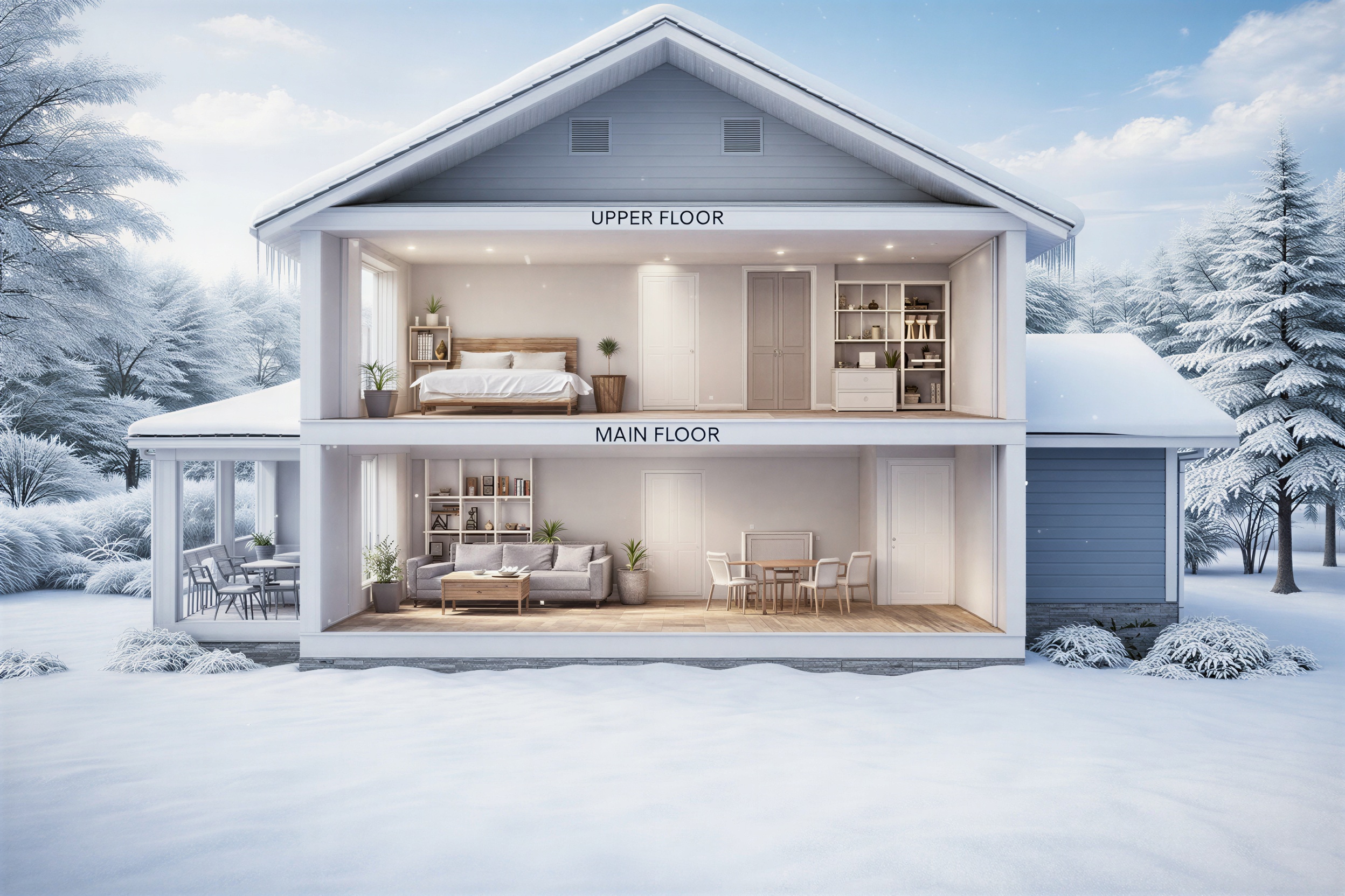 architectural cross section cutaway illustration of a two story commercial office building in summer setting the building is shown from the front with the facade cut away to reveal both interior levels simultaneously the cutaway reveals only the front portion of the building interior the back wall is a solid opaque wall with no windows no transparency and no view through to the outside exactly like a dollhouse cutaway where the rear wall is completely solid and closed exterior lush green landscape full leafy trees and manicured shrubs bright clear blue sky with soft white clouds warm golden sunlight modern commercial building facade with a mix of warm red brown brick walls and modest rectangular windows on the sides only flat roof with dark steel trim edging clean paved walkway leading from the street to the main entrance lush green front lawn stretching toward the viewer parking area visible on the right side upper floor open plan office space with workstations desktop computers ergonomic office chairs standing desks large indoor plants pendant lighting fixtures hanging from a white ceiling solid painted back wall with no windows warm professional interior lighting main floor ground level reception area with a front desk open workspace with desks office chairs laptops and large indoor plants polished concrete or tile flooring glass entrance doors at the front only solid painted back wall with no windows the ground floor sits directly at grade level with landscaping meeting the base of the building seamlessly photorealistic rendering style clean modern commercial interior bright natural lighting the rear interior wall on both floors must be completely solid with no windows no openings and no outdoor views visible from behind no basement no void beneath the building no text labels no arrows no annotations
