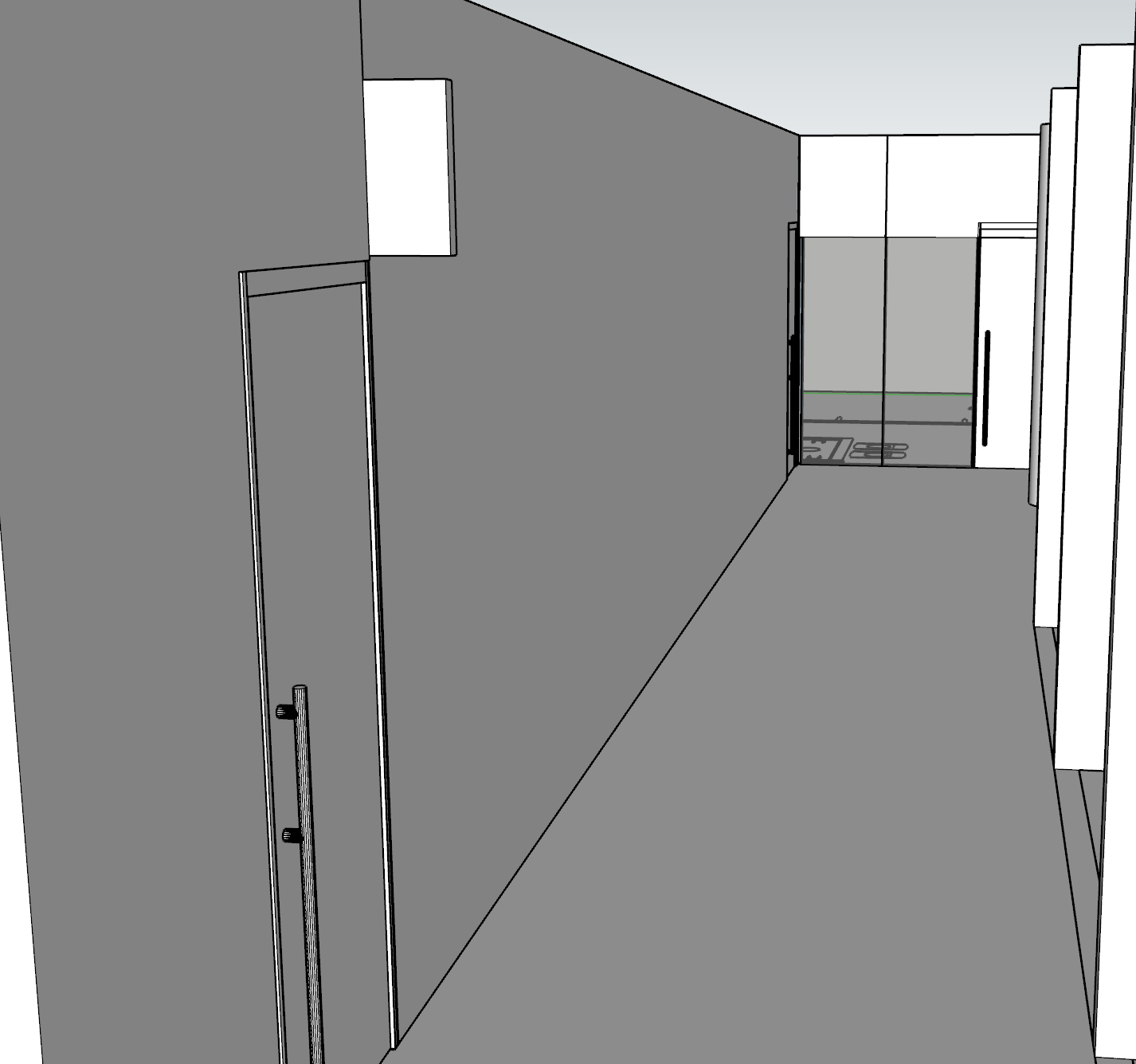 put a quarter drop water display on the left wall in the middle and show clear wayfinding in this corporate office thats main colors are navy with white terrazzo floors and hints of orange and yellow as well on the sign put a number and make it glow like a grocery isle sign architecture