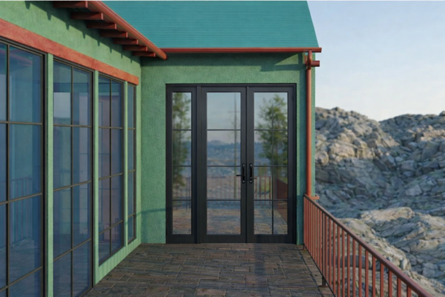 exterior shot make the deck extend in all the front of the house add a california hills landscape