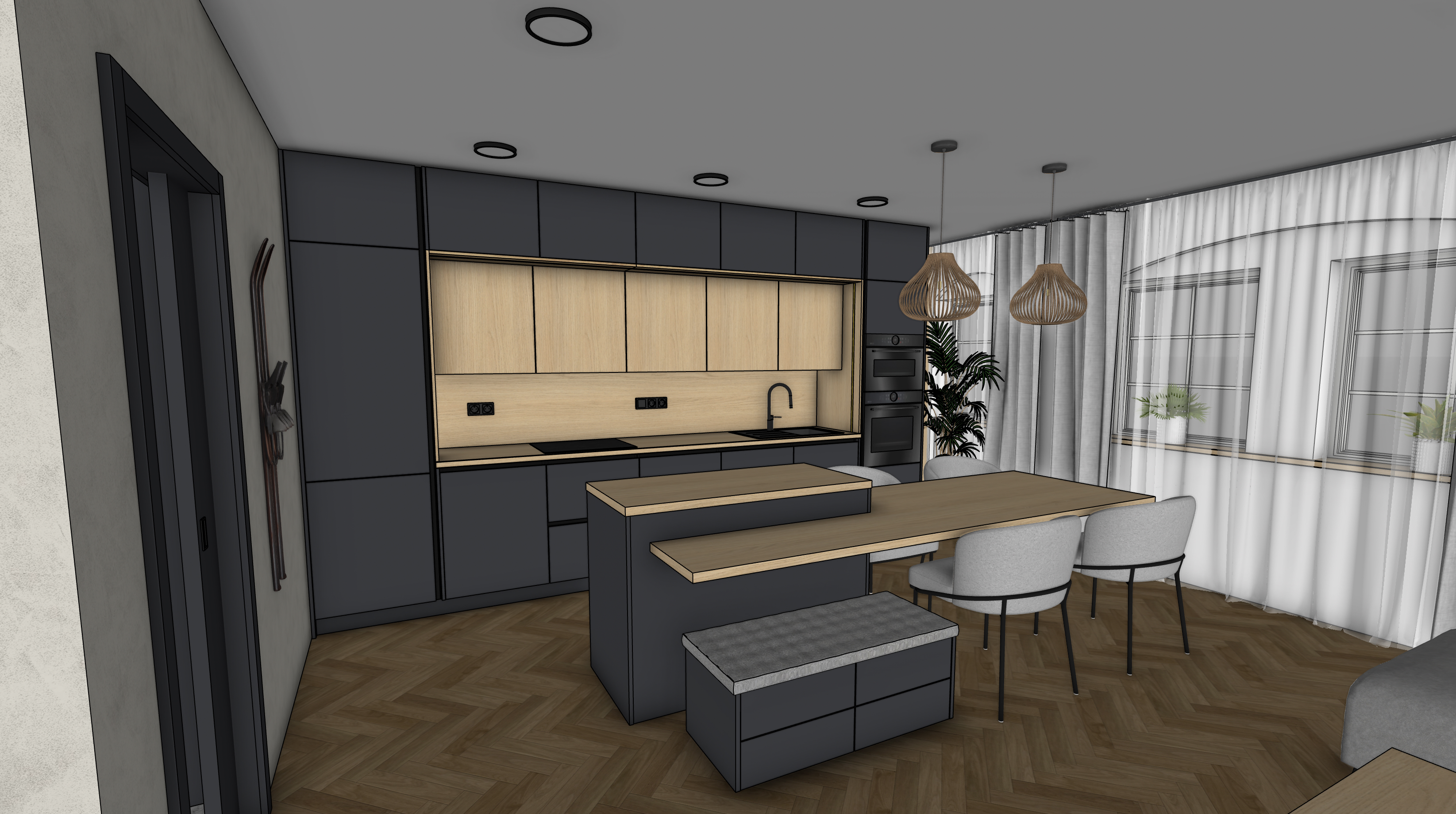 photorealistic render of the uploaded sketchup kitchen image preserve exact camera angle and all original textures materials no redesign add realistic warm led under cabinet lighting ceiling lights and sunny daylight from outside with global illumination and natural shadows ultra realistic architectural photo ray traced 8k