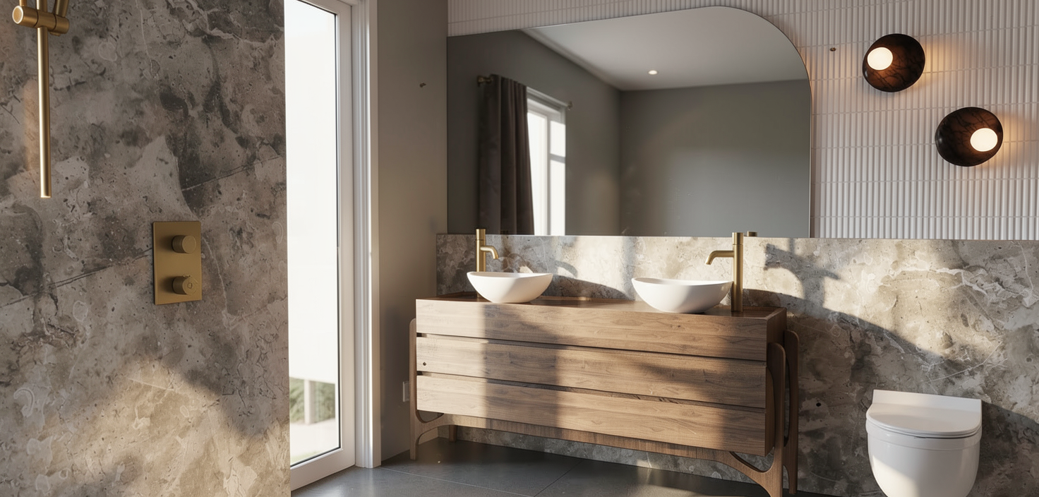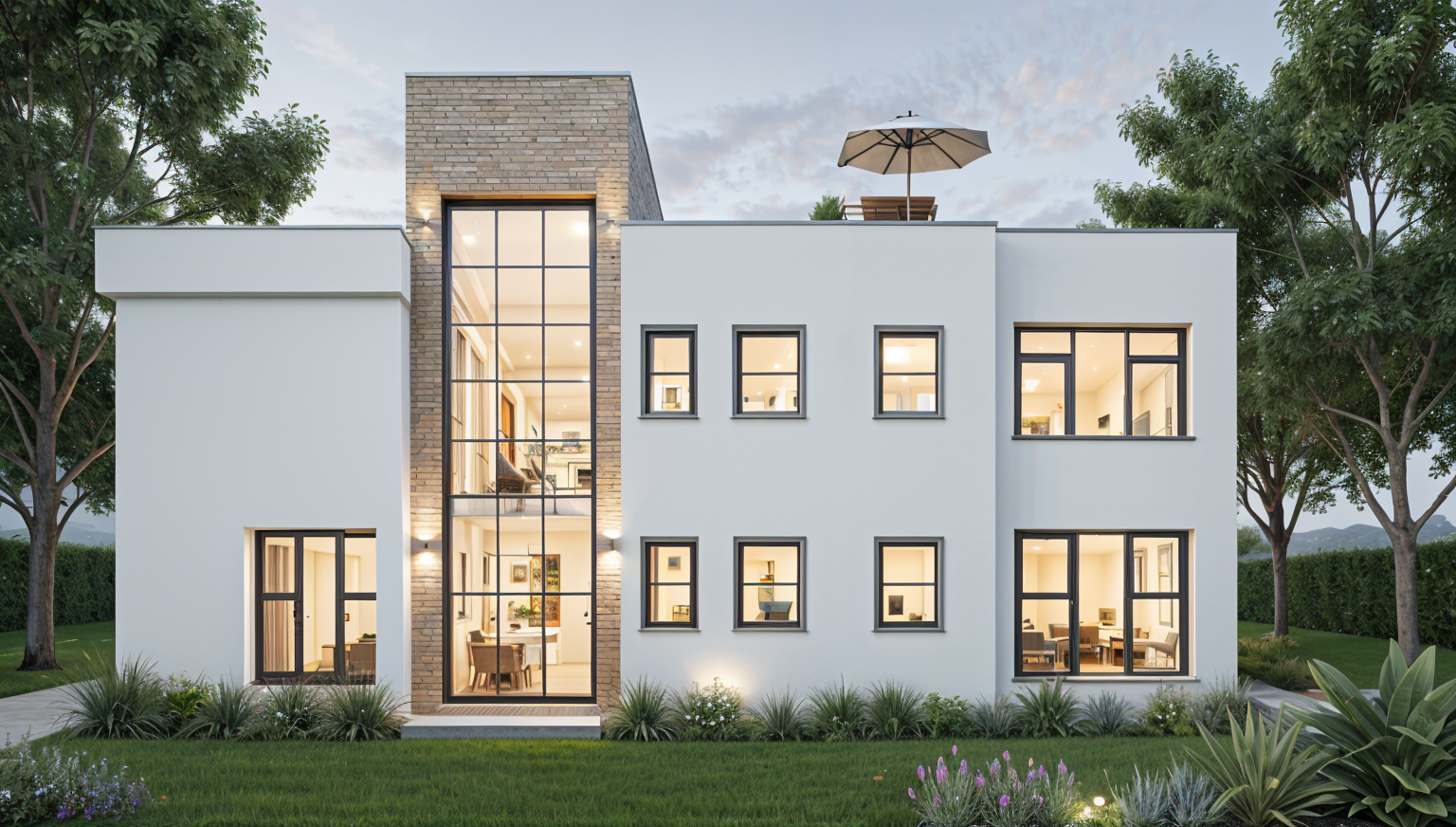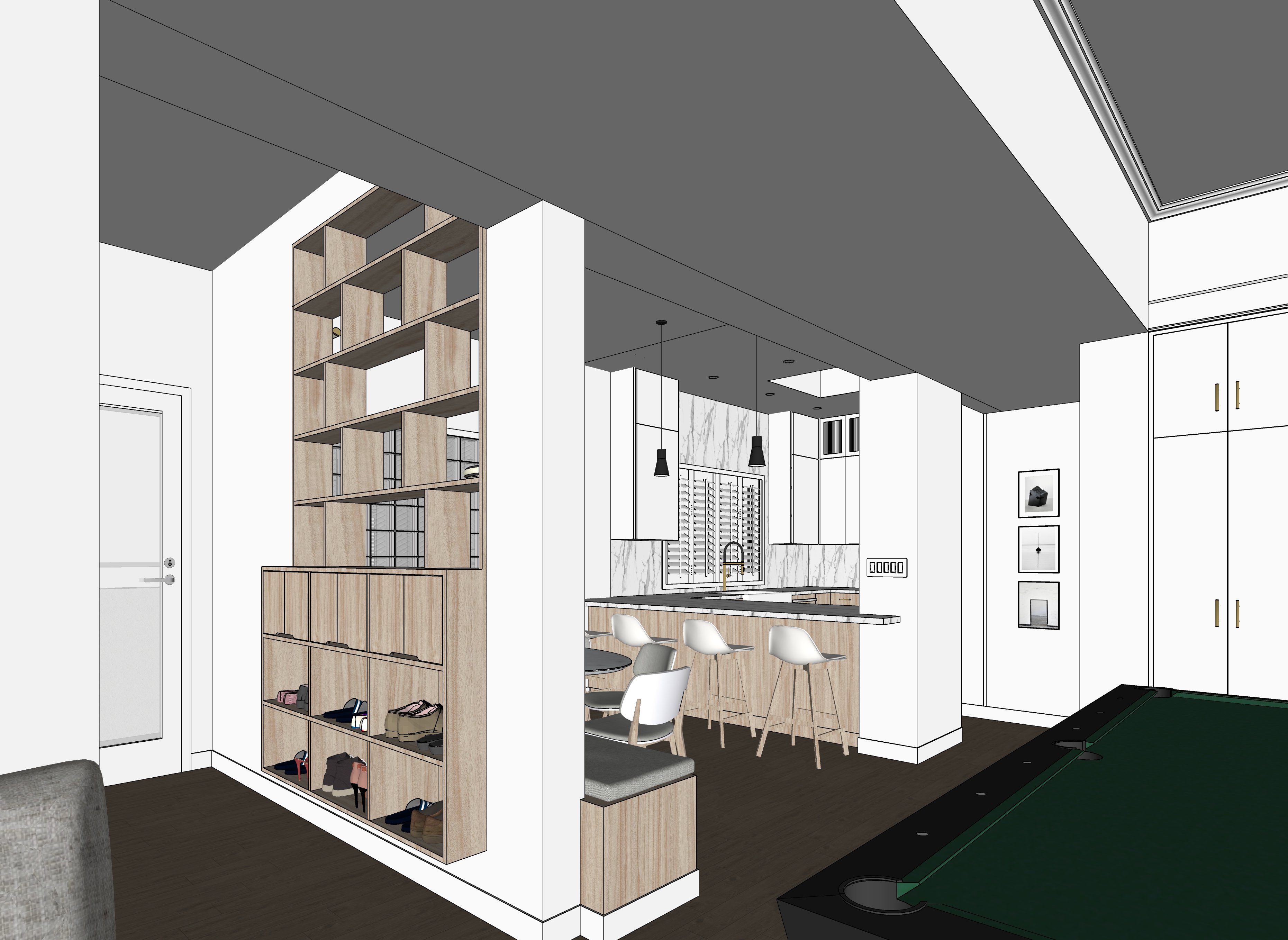 evening light outside the windows add light from the recessed lights add some accessories and books on the shelves at the left side of the view add a woman standing at the sink in the kitchen add a man sitting on a middle stool at the counter add some appetizers wine glasses and a bottle of red wine on the counter make the light level in the kitchen a little lower and warmer in color show the white calcutta same material on the wall of the kitchen as the counter add light from the recessed lights add some appetizers wine glasses and a bottle of red wine on the counter make the light level in the kitchen a little lower and warmer in color keep the shoes in the cabinet in the source image the upper cabinets in the kitchen are white make the entry door glass translucent all of the walls and ceilings are painted white