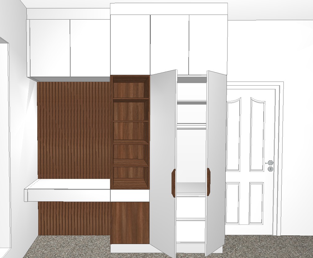 add a young child sitting at the desk add decor clothes in the wardrobe and natural light coming through the window