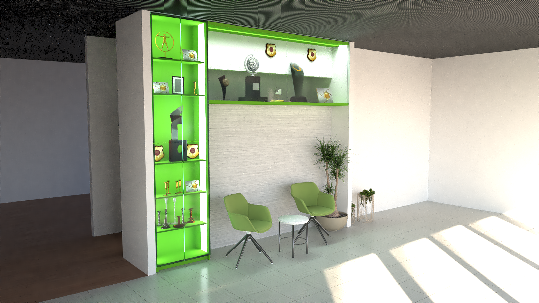 vstupn hala s vytr nama s trofejema vytr ny osv tlen led osv tlen m zam se na realistick osv tlen a optim ln st ny objekt zachovej barvy a dekory modern styl