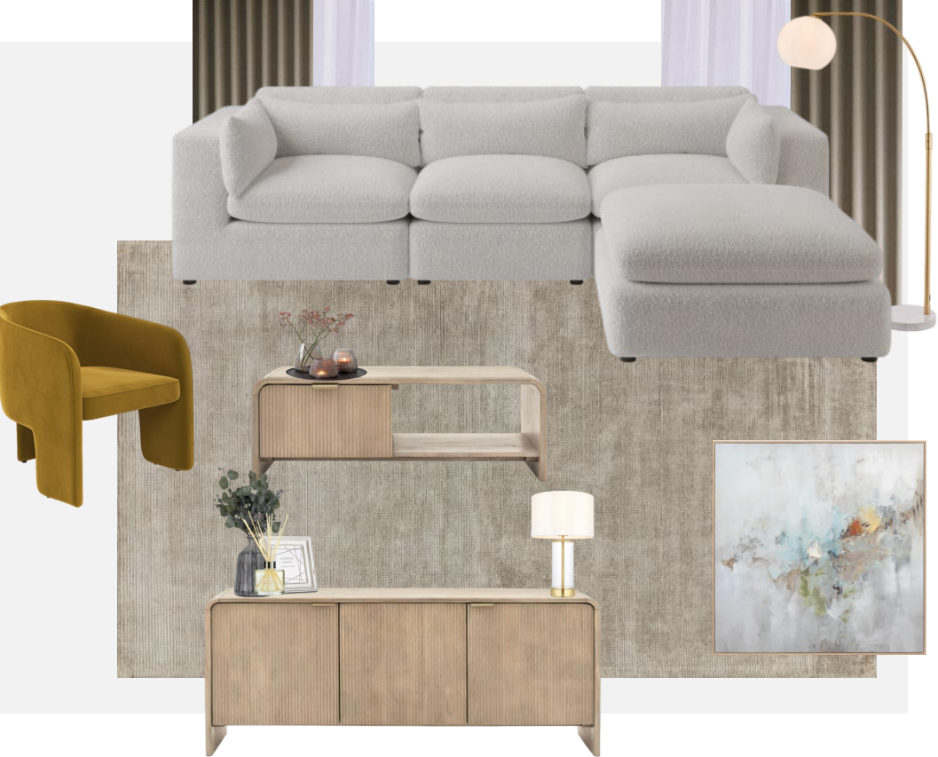 exterior shot add beautiful modern luxury curtains and white sheer voiles to window the sofa should face the sideboard sofa should be on left hand side wall the floor lamp should be beside sofa