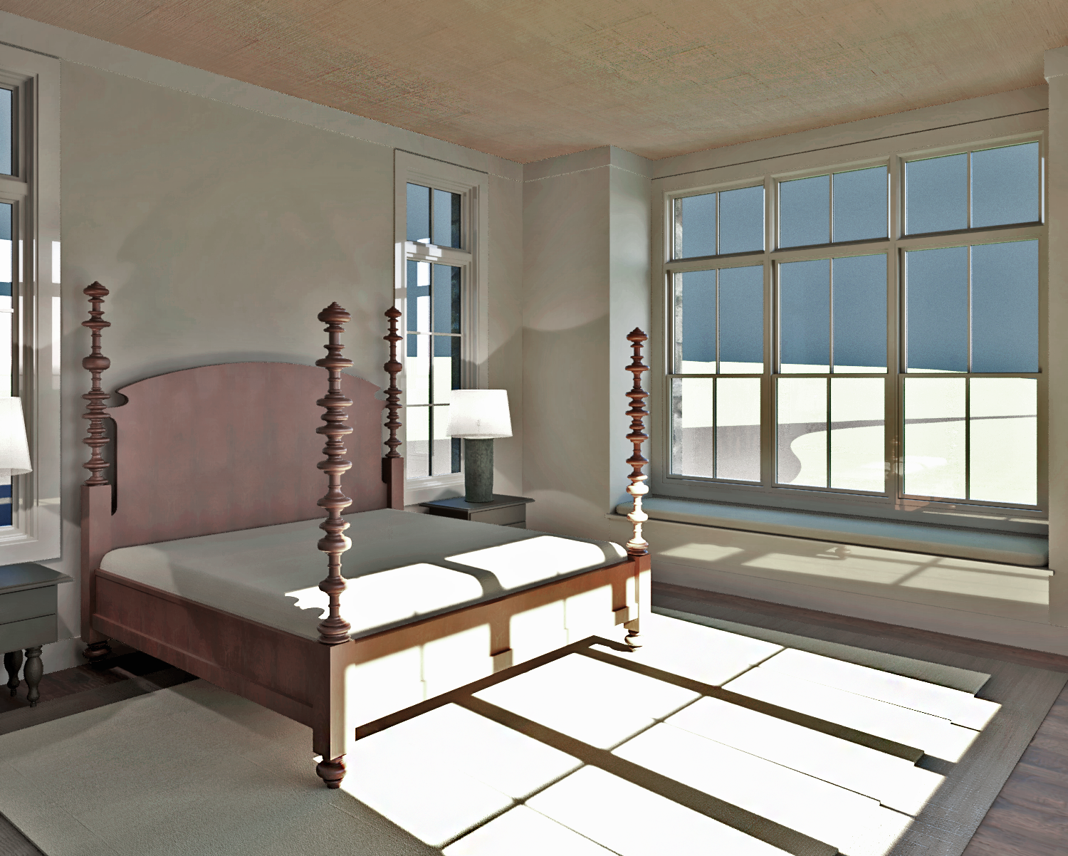 maintain existing materials grasscloth ceiling mahogany wood bed sisal layered rugs on floor midwest northwoods outside no hills comfy fluffy duvet and pillows on bed traditional crown molding