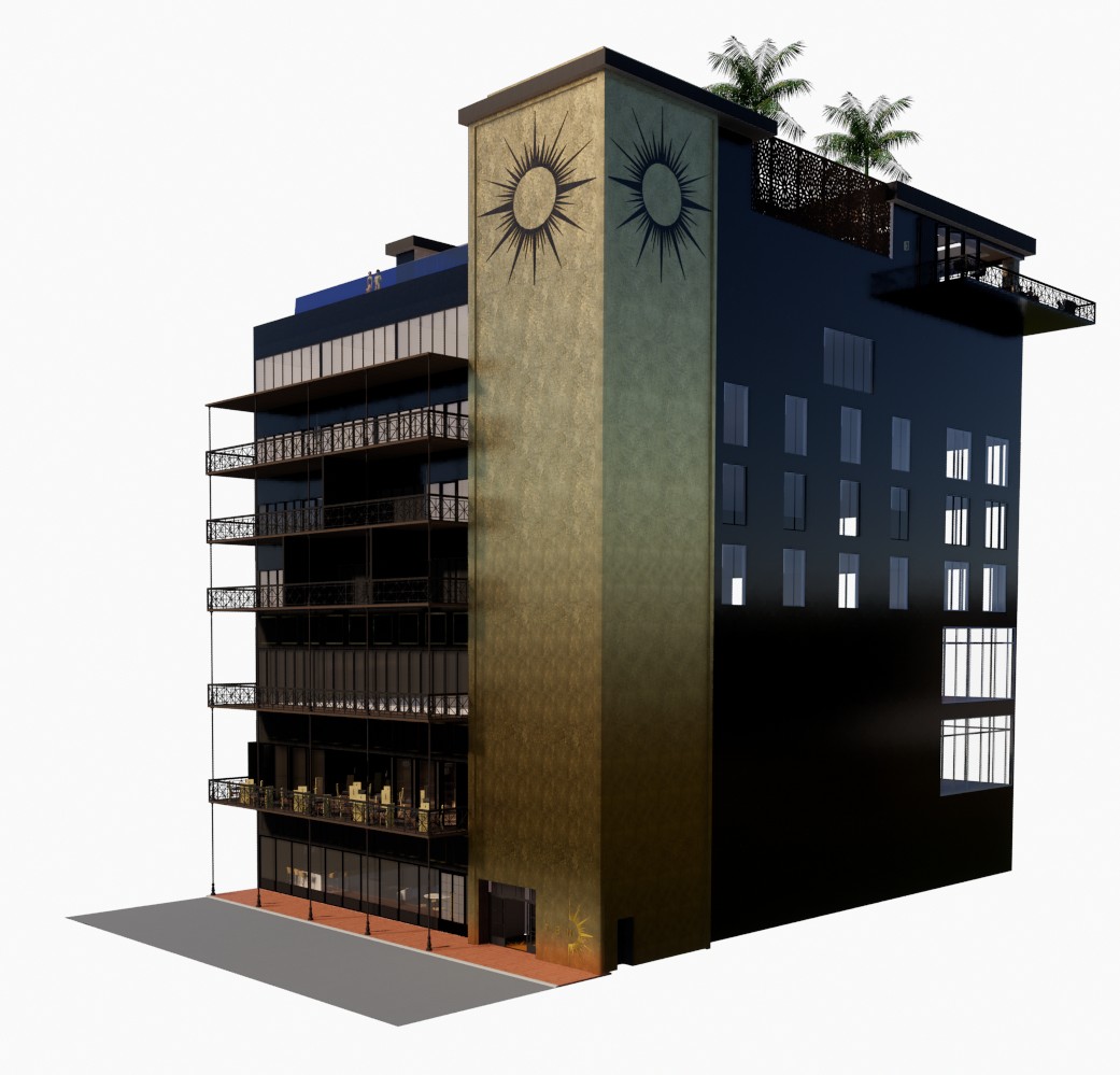 transform the provided exterior image into a high end photorealistic render place the building in new orleans la on a lively vibey street use modern cars show a night scene add the same palm trees to the side of the building and cobblestone streets from the previous rendering