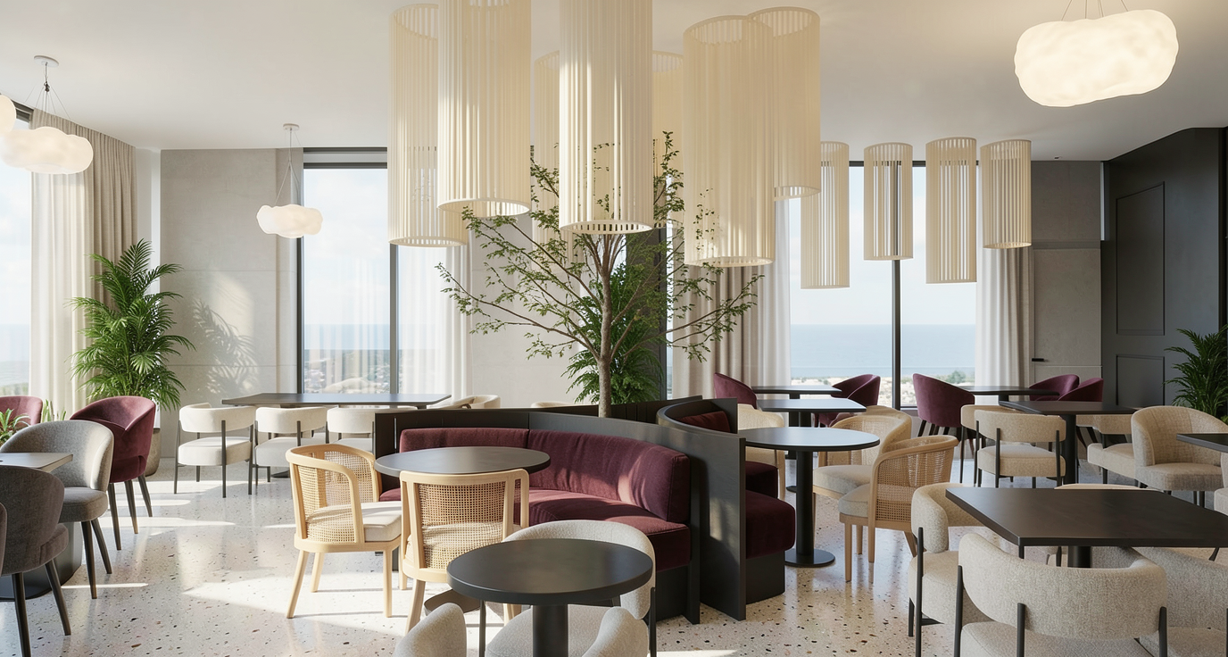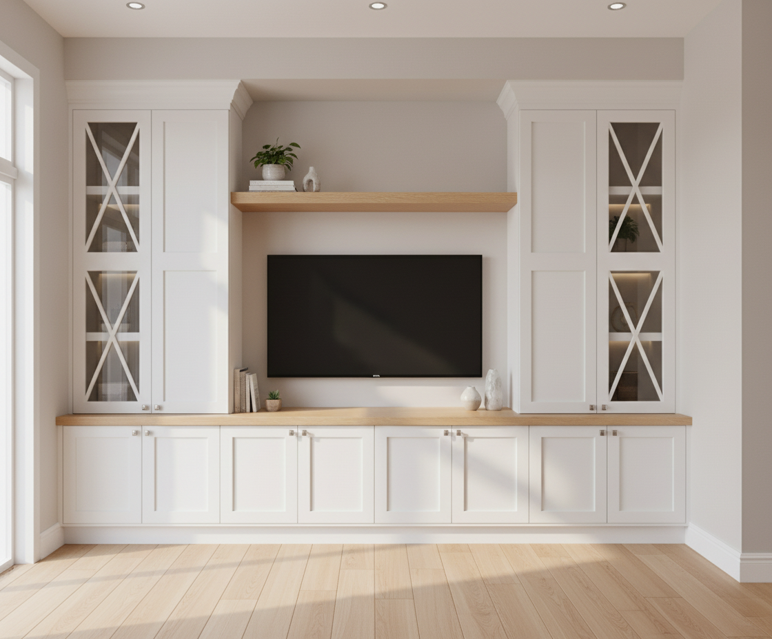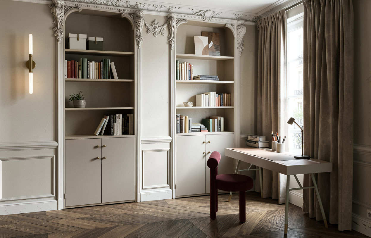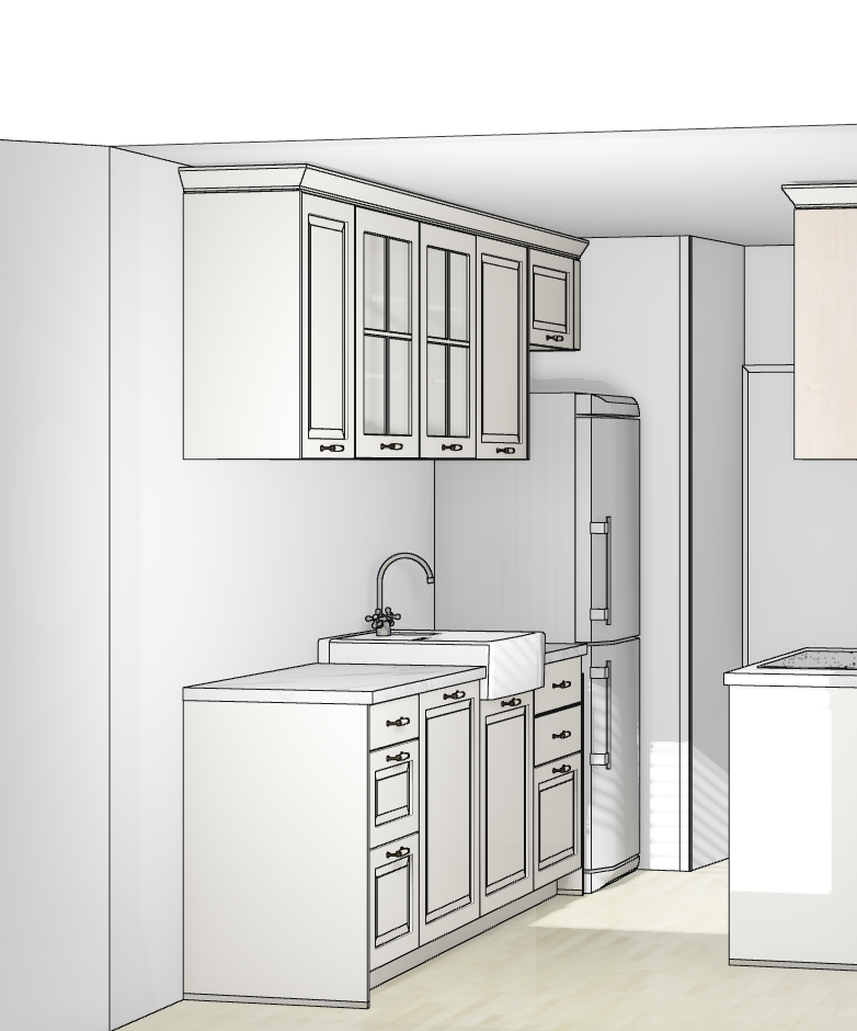 create a modern kitchen interior with an elegant and minimalist design use smooth matte cream beige for the cabinetry and subtly highlight with sleek silver handles the refrigerator is a inox matt providing a bold and classy contrast incorporate a light natural wooden floor that complements the neutral tones and adds warmth the countertops are pristine white enhancing the clean and sophisticated look ensure the lighting is soft and ambient with gentle shadows creating a cozy yet contemporary atmosphere do not add backsplashes or any other units or elements that are not initially included