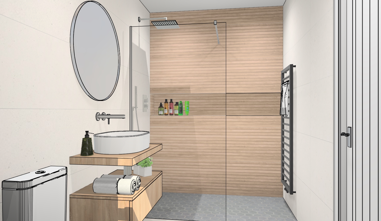 a modern bathroom interior with a minimalist aesthetic the walls are a clean soft white the shower area features light natural wood panels providing warmth include a sleek glass shower door and a hexagonal patterned grey floor the sink is a simple white basin on a light wood vanity accompanied by a large round mirror add subtle green accents with small plants and toiletries use chrome for faucets and fixtures the atmosphere is calm and inviting with a soft natural lighting ambiance
