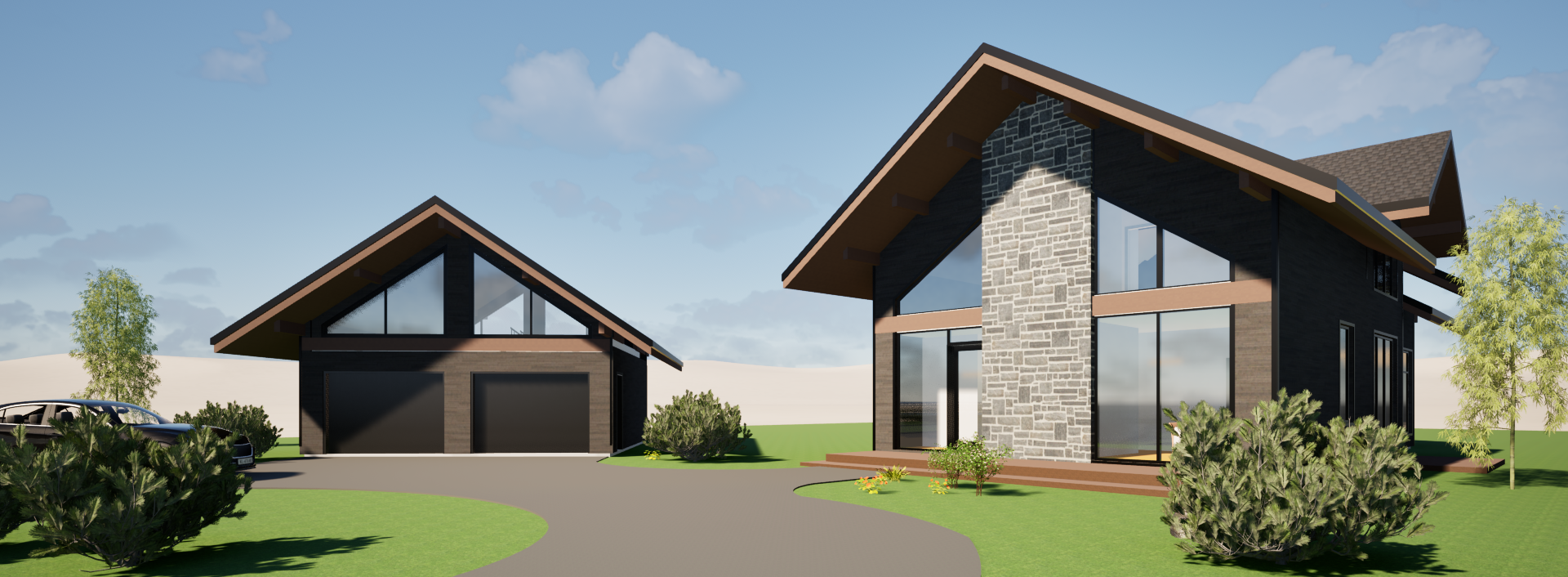render a serene residential scene featuring two modern a frame houses the houses have dark wooden exteriors contrasting with large clear glass windows the roofs have dark brown shingles with natural wooden accents surrounding the houses are lush green lawns and small bushes interspersed with a few slender trees with light green foliage the atmosphere is calm and inviting with a soft blue sky dotted with light clouds the sunlight casts gentle shadows highlighting the stone textures on the main house include a smooth curving driveway connecting the houses and ensure the overall mood is peaceful and welcoming