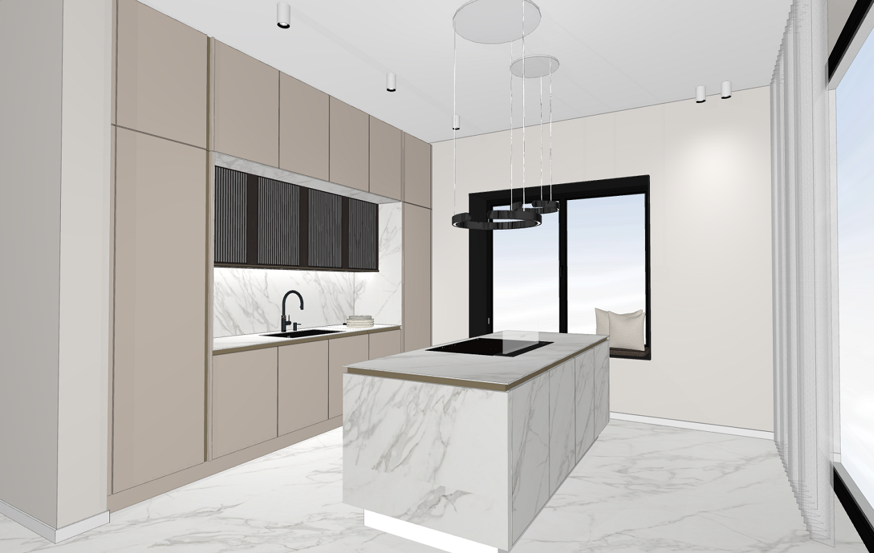 create a rendering without adding any decorative elements maintain the materials as they appear in the image add lighting beneath the tall glass cabinets in the niche vertical and horizontal recessed handles with lighting