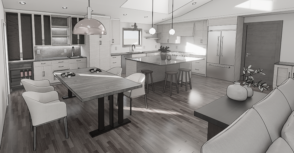 add color remove furniture show cabinetry in white oak island and countertop near sink and stove with white carrara countertop add gray glass as vertical surface between metal mesh cabinet and tall cabinet keep island white oak wood base with thin shaker panels keep bronze metal mesh in cabinet left of small sink