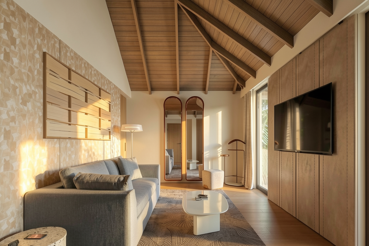 turn the ceiling lamp on 35000k the drawer under the tv and the lamellas the same color as the wall behind add led light shining from behind the gap on wall on the left delete led light on the wall behind the tv