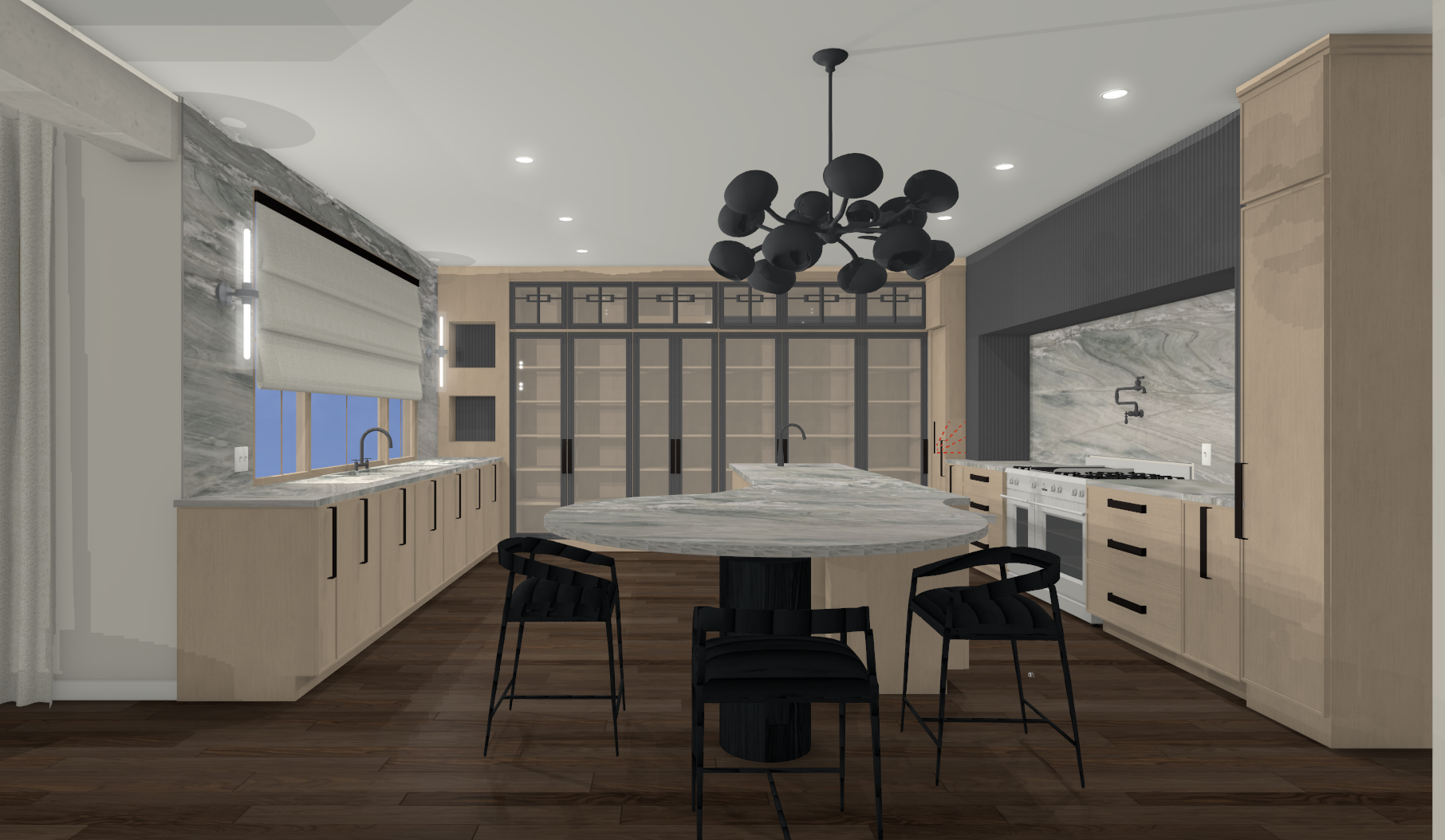 interior shot only change hood material add countertop material add backsplash material also style with books a corner tree dishes a couple of vases and natural lighting make the stools natural in color make the glass doors bronze