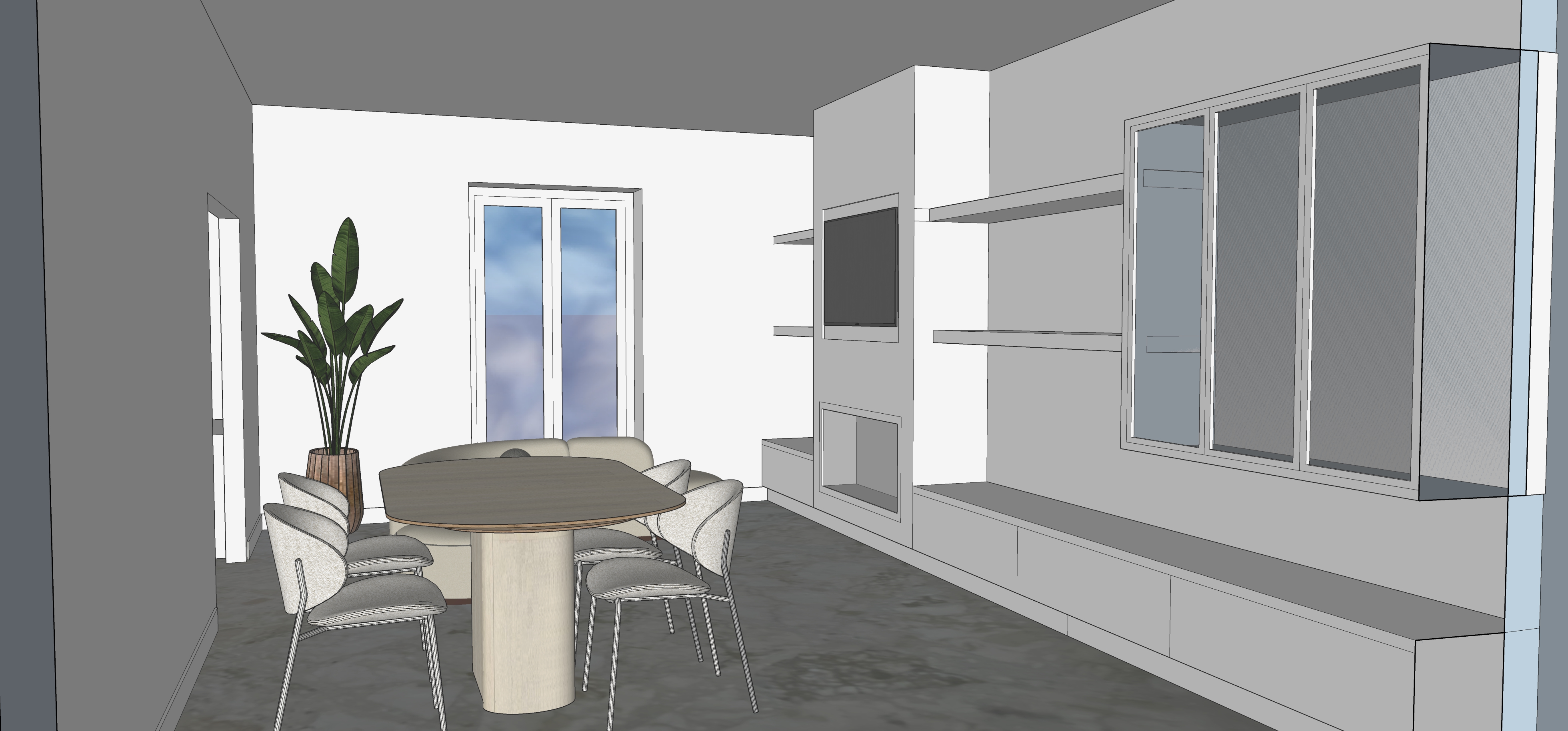 render a modern apartment floor plan with a warm and inviting atmosphere highlight light oak wood flooring with a chevron pattern use soft gray for the walls accented with crisp white for the trims and interior doors add dark gray countertops in the kitchen introduce a cozy living room area with a plush beige rug and a soft cream colored sofa use dark wood for the dining table with off white chairs include lush green indoor plants for a touch of nature ensure bright natural lighting flows through large windows