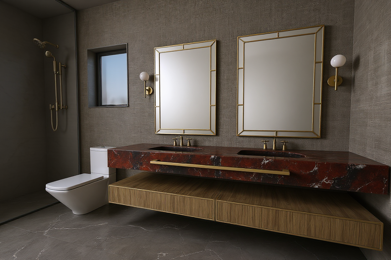 traditional style house with dark roof dark cedar post red and black mix brick metal awnings dark back doors and windows