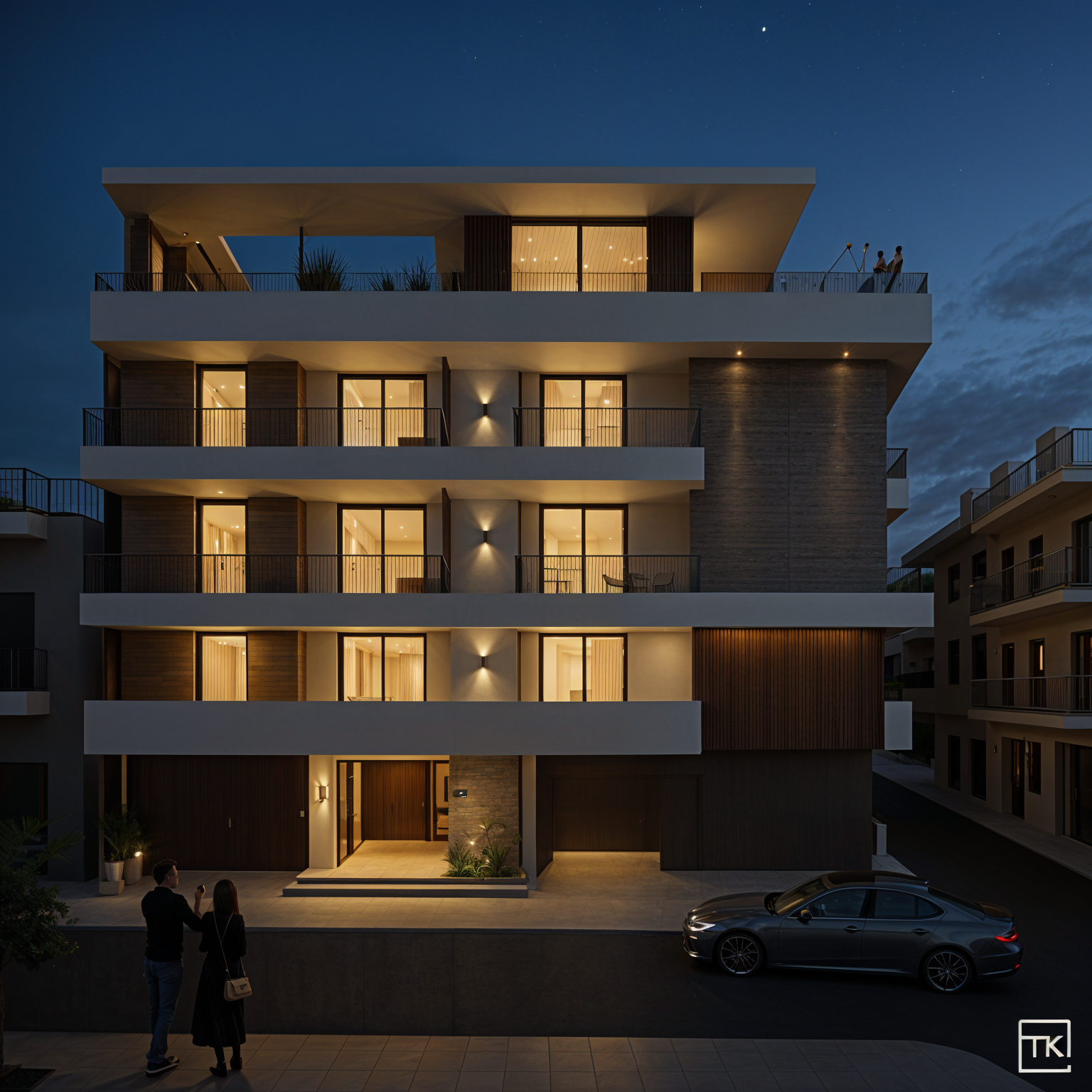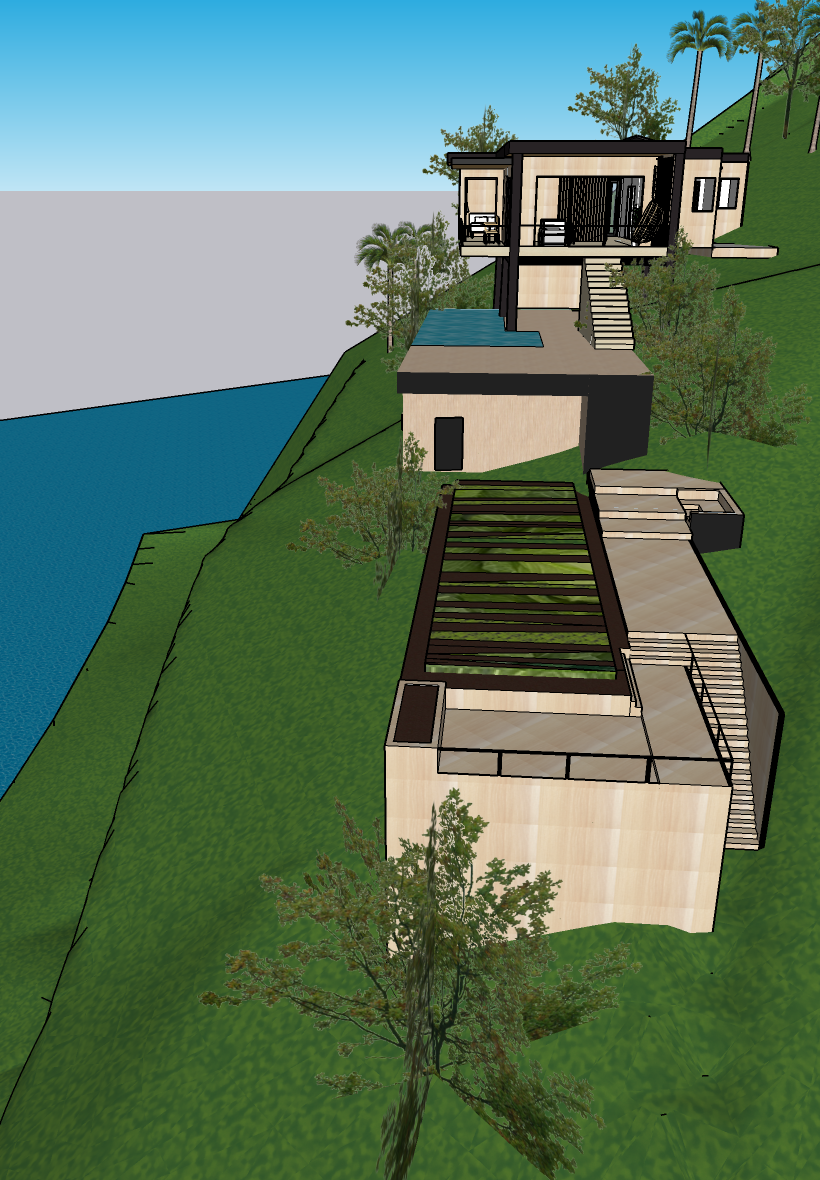 a modern hillside villa overlooking the ocean featuring sleek beige and black wood finishes the villa includes large glass windows and a minimalist design with an infinity pool surrounded by lush green grass and scattered tropical trees the lowest terrace features a neatly planted vegetable patch the sky is a clear vibrant blue with sunlight casting soft shadows creating a serene and luxurious atmosphere
