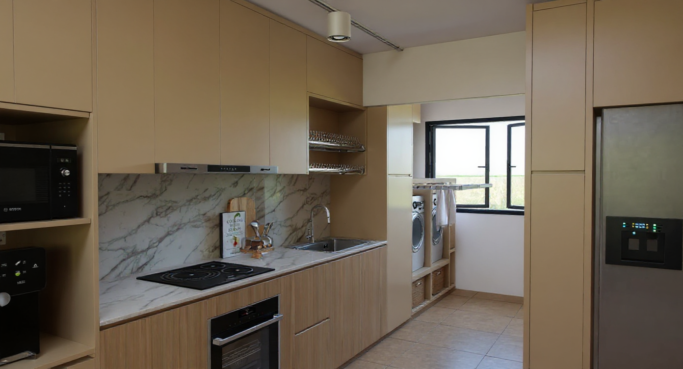 black weatherboard cladding with schist stone features black roofing black window frames lawns extensive native planting background trees sunset interior lights on