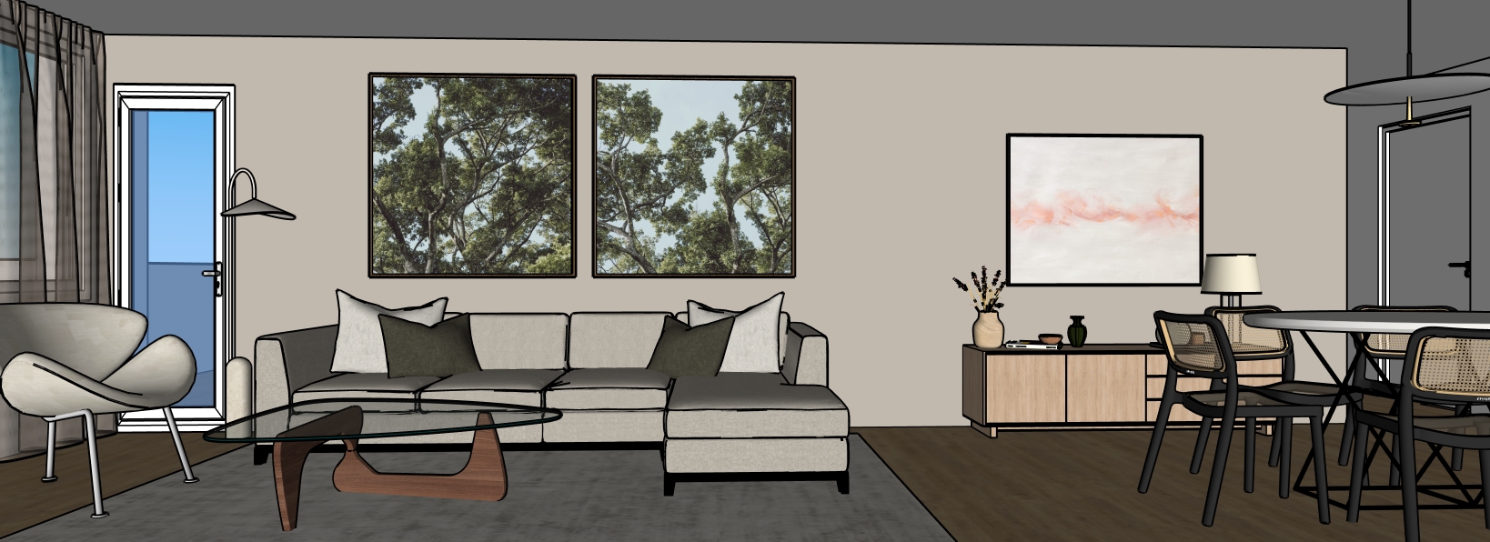 modern living room cozy and elegant atmosphere the walls behind the sofa is painted in soft taupe use warm lighting to create a welcoming ambiance the sofa is a light gray color with plush cushions in earthy tones olive green and beige the dining table is off white the rug behind the sofa in light gray and beige tones the console on the right side is warm eiche color
