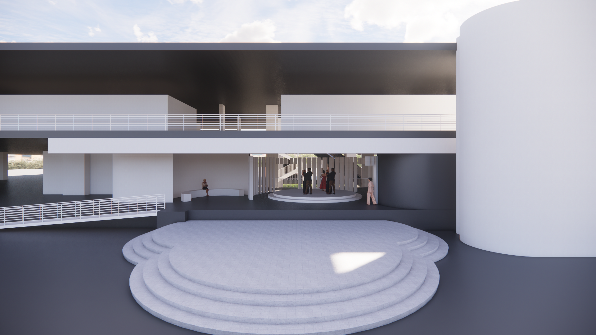 modernist interior shot this is an elderly community center all the materials are wood add some elderly people and they are dancing on the stage try to add more facilities for them also make the space more spatial architecture